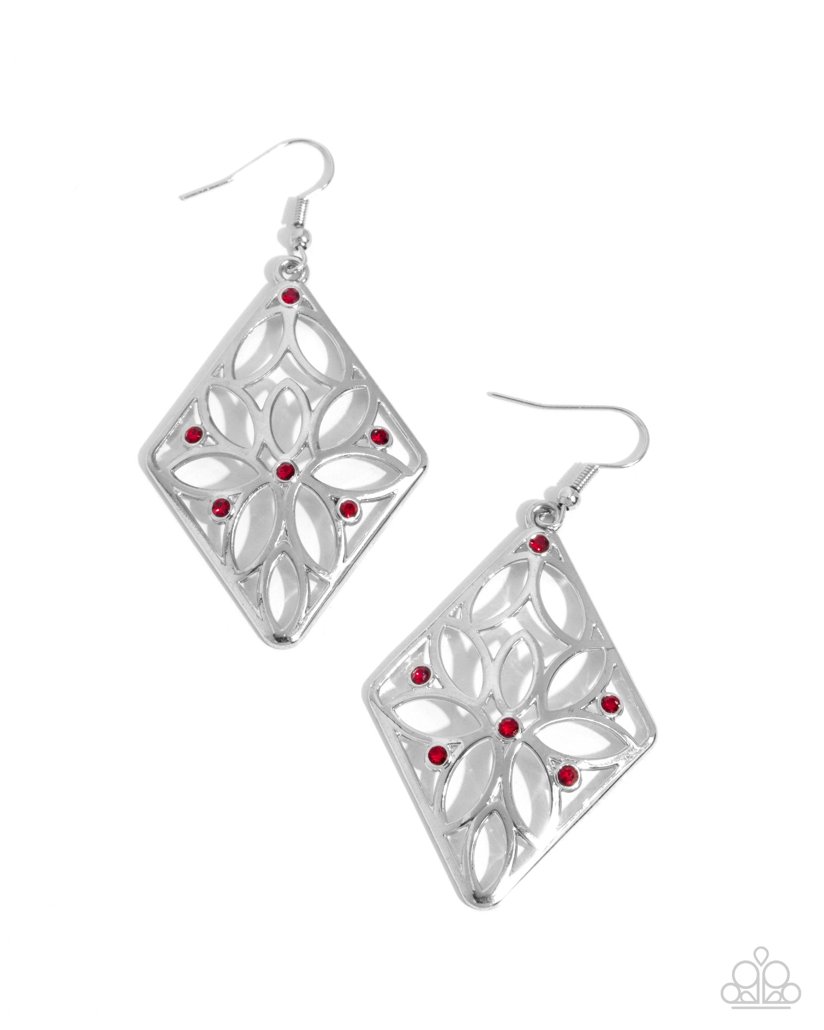Infused with dainty red rhinestones, shiny silver petals gather into an airy floral backdrop inside a diamond shape frame for a whimsical lure. Earring attaches to standard fishhook fitting.