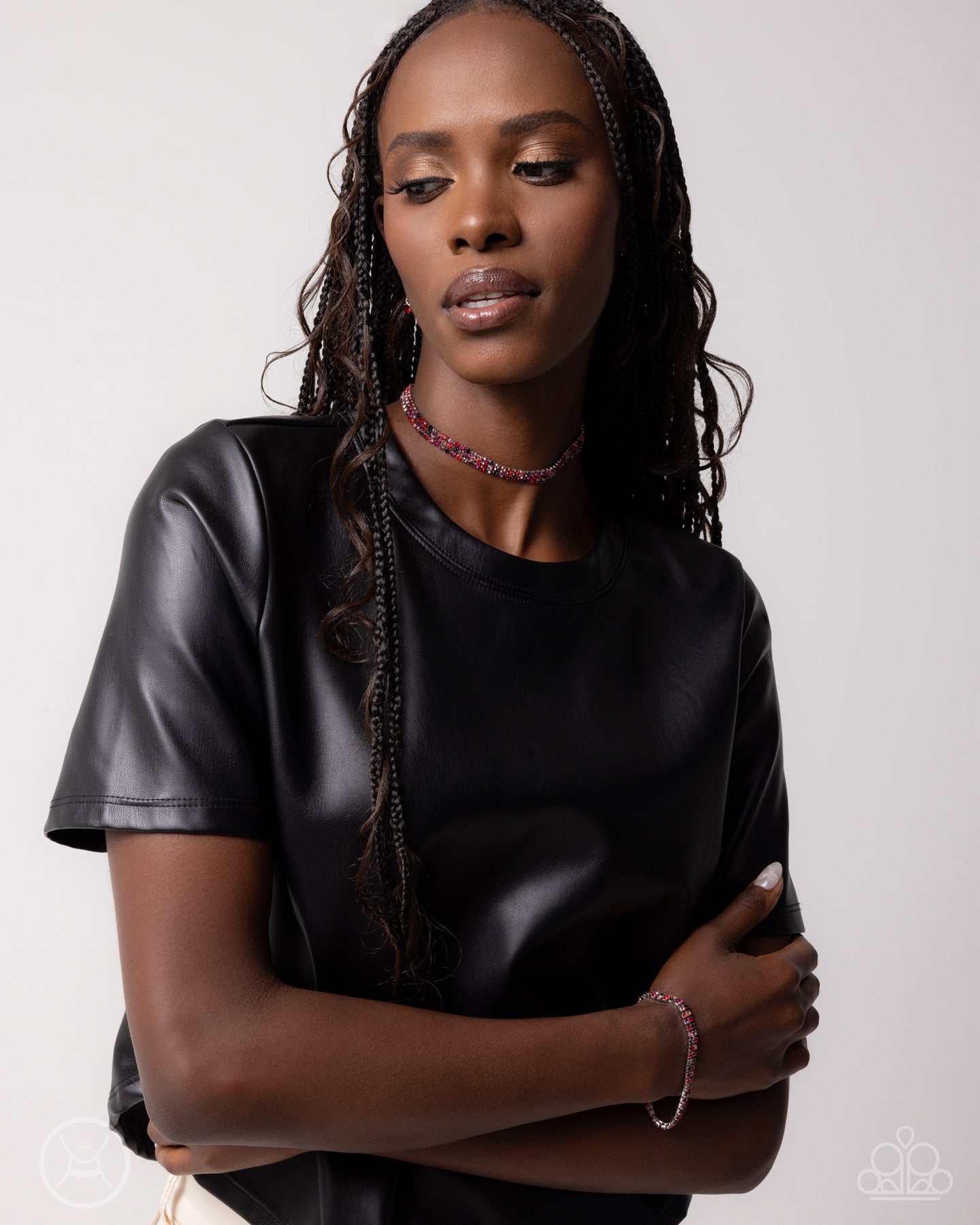 BRACELET: Thrilling Trio • Red P9RE-RDXX-172EH: Featuring sleek square fittings, strands of glittery red multicolored crystal-like and faceted rhinestones coalesce into a regal display around the wrist. Features an adjustable clasp closure.