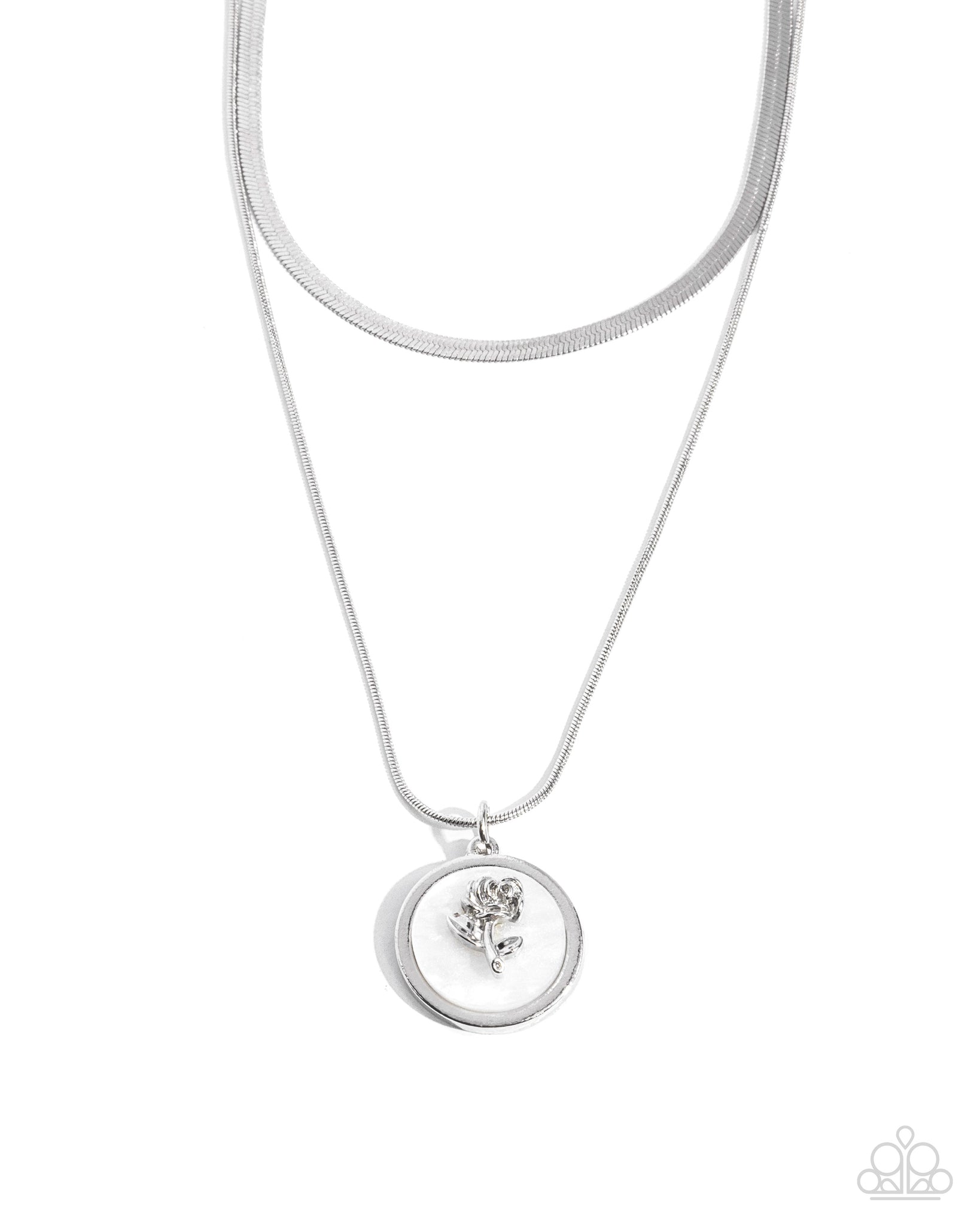 Featured in the center of a white shell, a glistening silver rose pendant glides along a dainty silver chain. A bold silver herringbone chain layers above the rosy display for an additional touch of grit and glitz. Features an adjustable clasp closure.