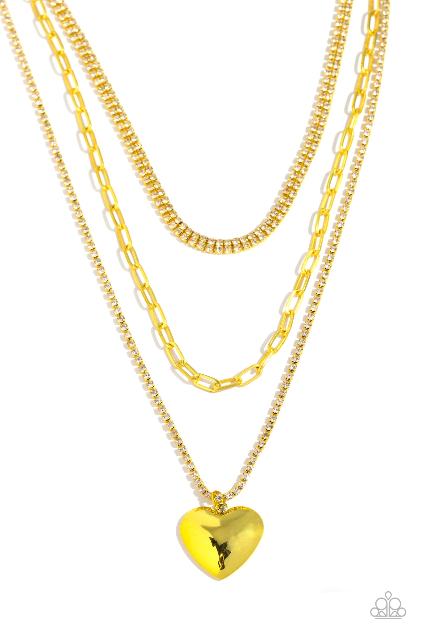 Featuring a yellow-painted hue, a trio of paperclip, rhinestone-encrusted box chain, and layered rhinestone-encrusted box chains coalesces down the neckline for a monochromatic masterpiece. Strung on the lowermost yellow box chain, a yellow heart pendant stands out and reflects light in every direction for a statement finish. Features an adjustable clasp closure.