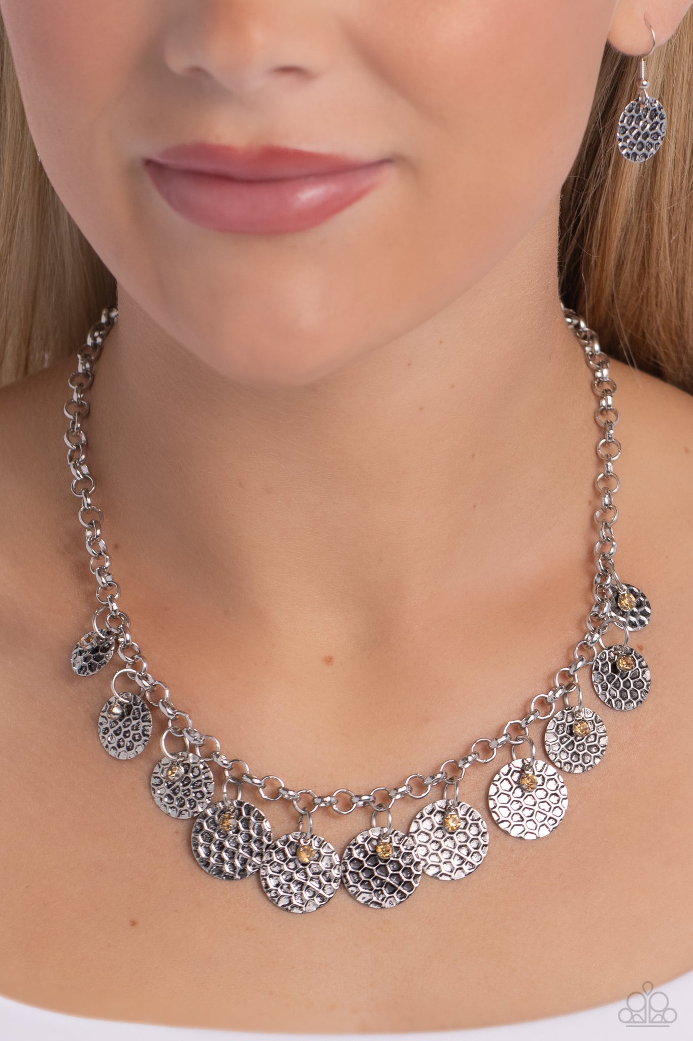 Antiqued silver discs hammered with a dappled design, dangle delightfully across the collar from a silver chain. Dainty topaz rhinestones dance in front of each disc for a collision of flirtatious earthiness. Features an adjustable clasp closure.