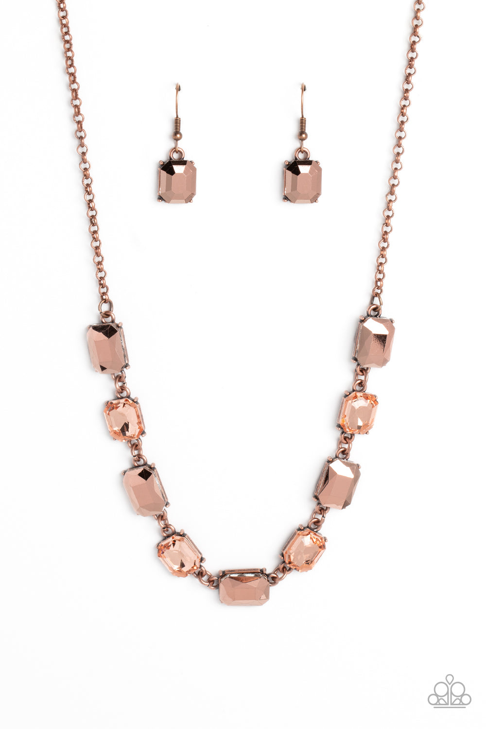 A dazzling collection of emerald-cut gems splashed in peachy hues, and coppery aurum are featured in this stunning statement piece. The aurum emerald-cut beads cascade down the neck from a classic copper chain for a refined splash of color. Features an adjustable clasp closure.