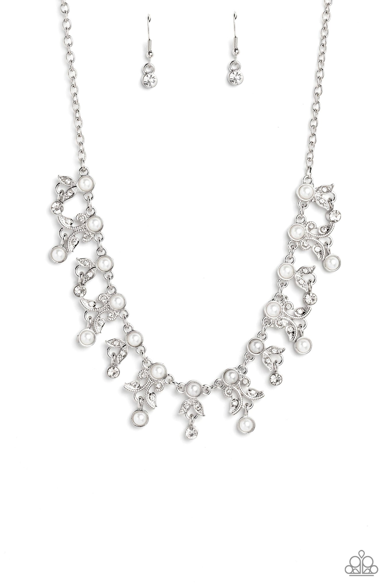 Infused along a classic silver chain, a row of white pearls, pressed into silver frames, stands out against the collar for a touch of refinement. Dangling below the row of white pearls, a shimmery collection of leaf-like filigree and detailing, studded with dainty white rhinestones and silver studs, adds a botanical element to the elegant display. Crystal-like white gems and white pearls encased in silver frames, dangle below every other botanical charm, rounding out the design with whimsical movement. Features an adjustable clasp closure.