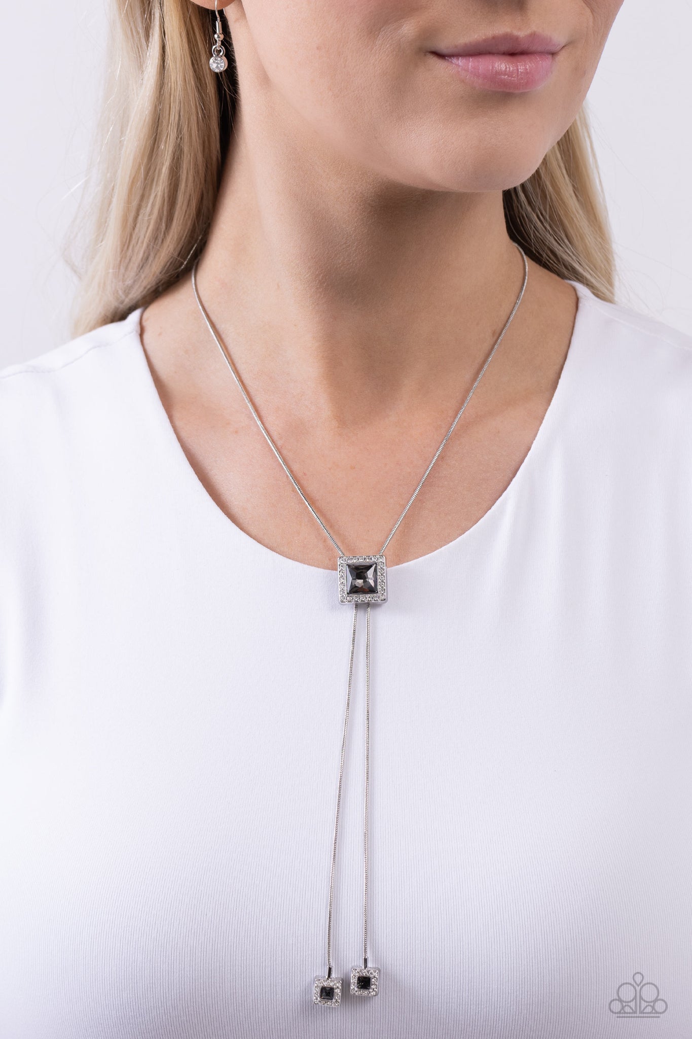 Bordered in dainty white rhinestones, a smoky, square-cut gem is pressed into a silver square fitting. The glitzy pendant slides along a strand of silver snake chain with smaller copies of the square pendant on each end of the adjustable strand for a seasonally edgy look. Features a bolo closure.