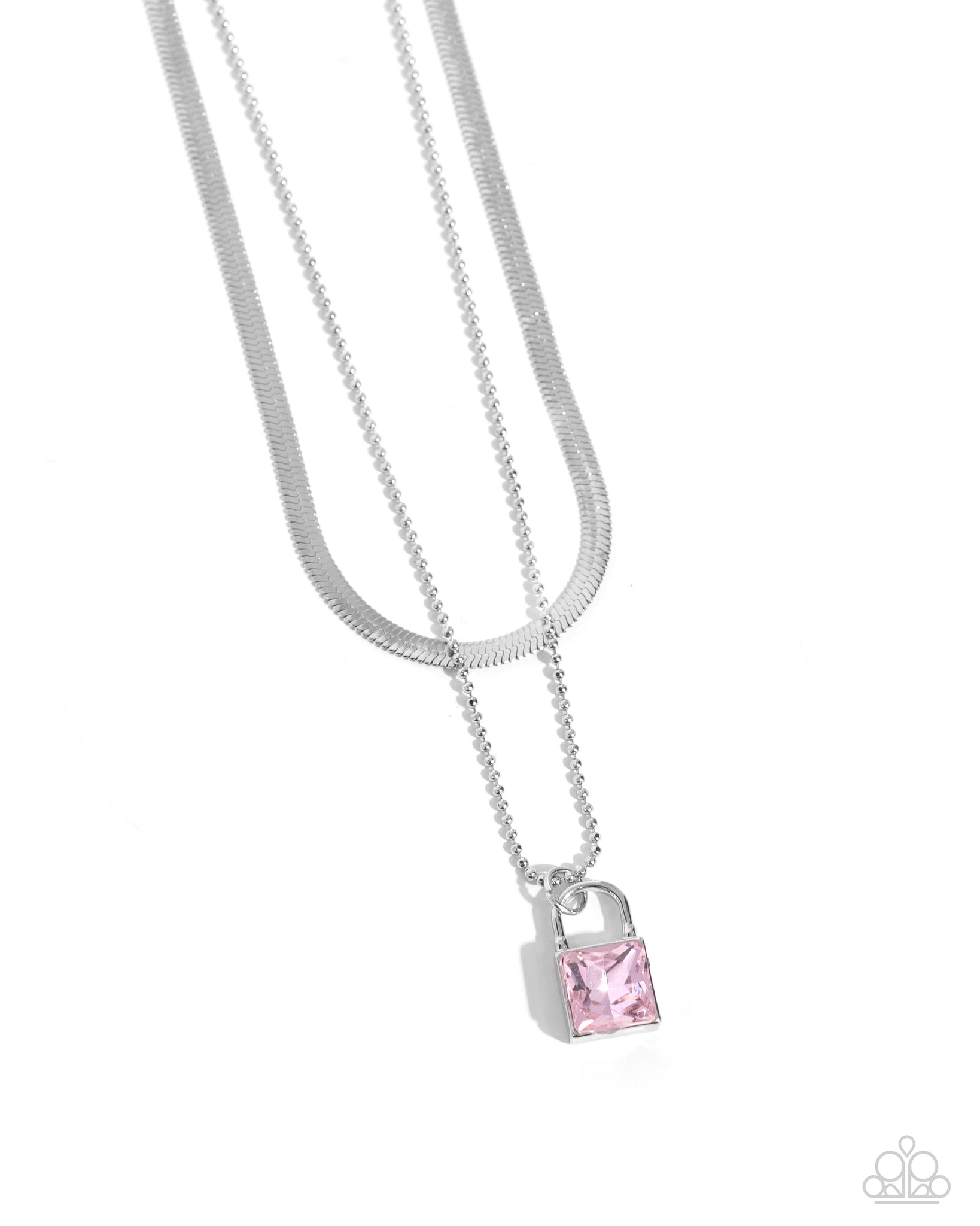 Pressed in a silver padlock pendant, a square pink gem glistens and glides along a dainty silver ball chain. Layered above the gritty glittery display, a silver herringbone chain creates additional edge and detail. Features an adjustable clasp closure.