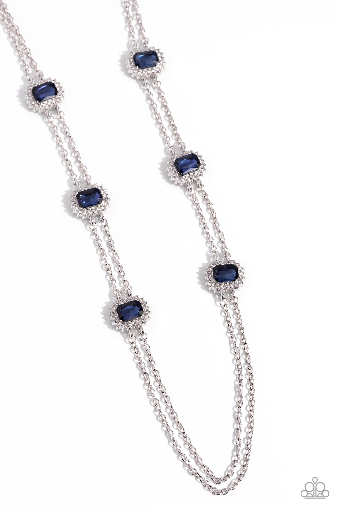 Pressed in sunburst-like, rhinestone-encrusted pronged silver fittings, a collection of emerald-cut blue gems are infused between a double-strand of silver chains for a standout statement. Features an adjustable clasp closure.