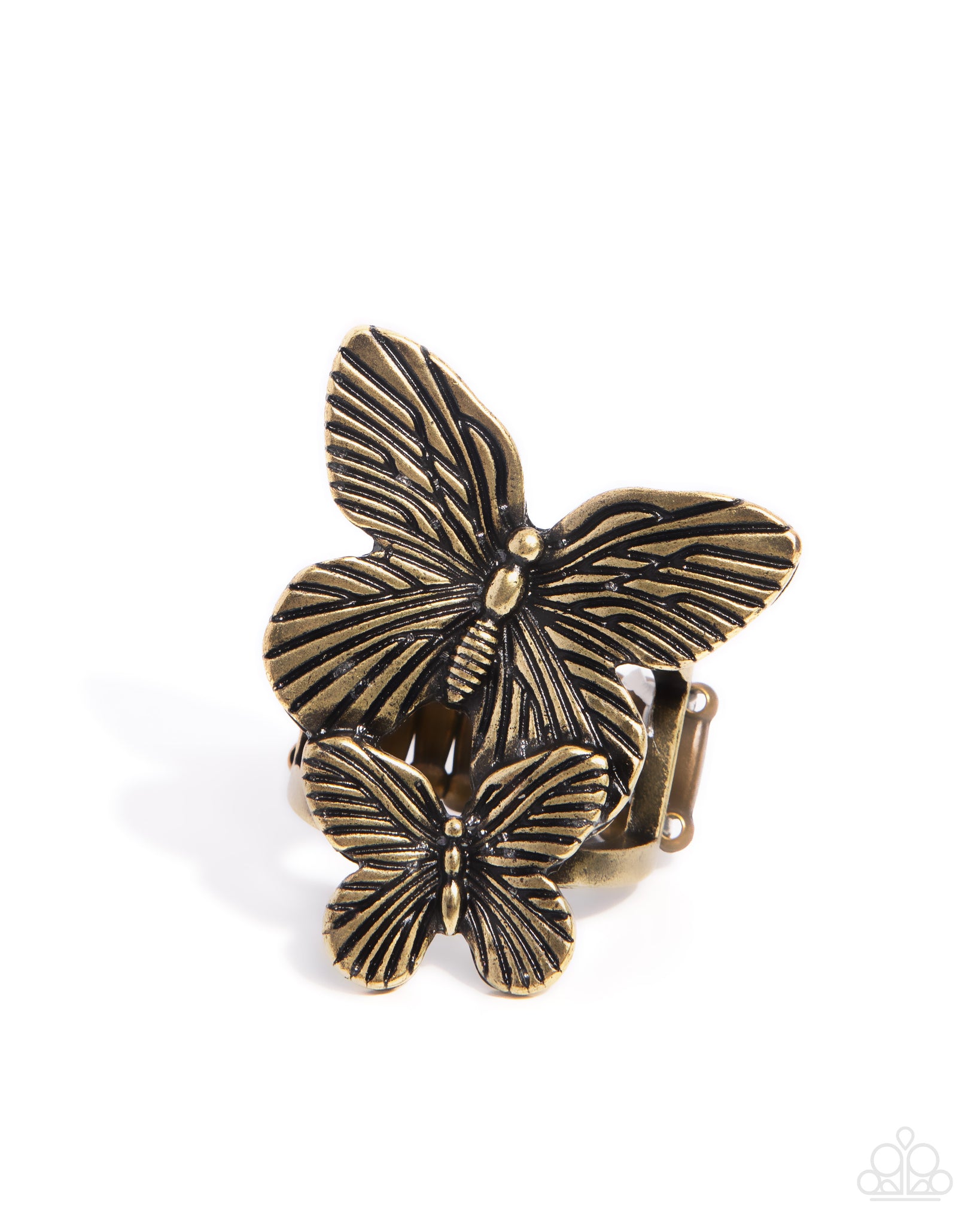 Veined with lifelike textures, a pair of rustic brass butterflies in varying sizes flutters atop the finger for a whimsical fashion. Features a stretchy band for a flexible fit.