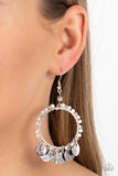 Textured silver discs chime at the bottom of a silver wire hoop. Pearly, white, and glassy seed beads are threaded along an invisible wire and wrapped around the hoop for a bohemian vibe. Earring attaches to a standard fishhook fitting.