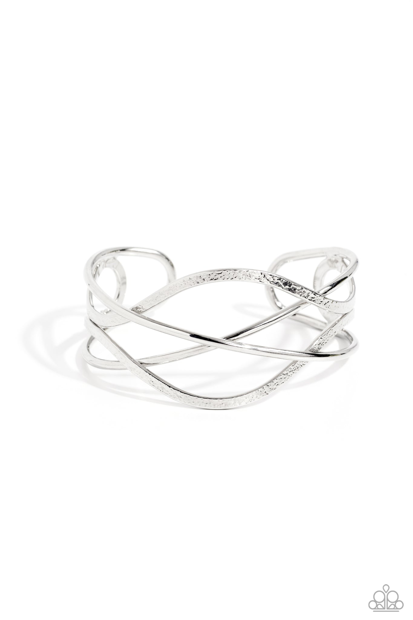 Shiny silver bars and hammered silver ribbons delicately crisscross and whirl around the wrist into a solitaire cuff, creating a flawless fusion of metallic shimmer.