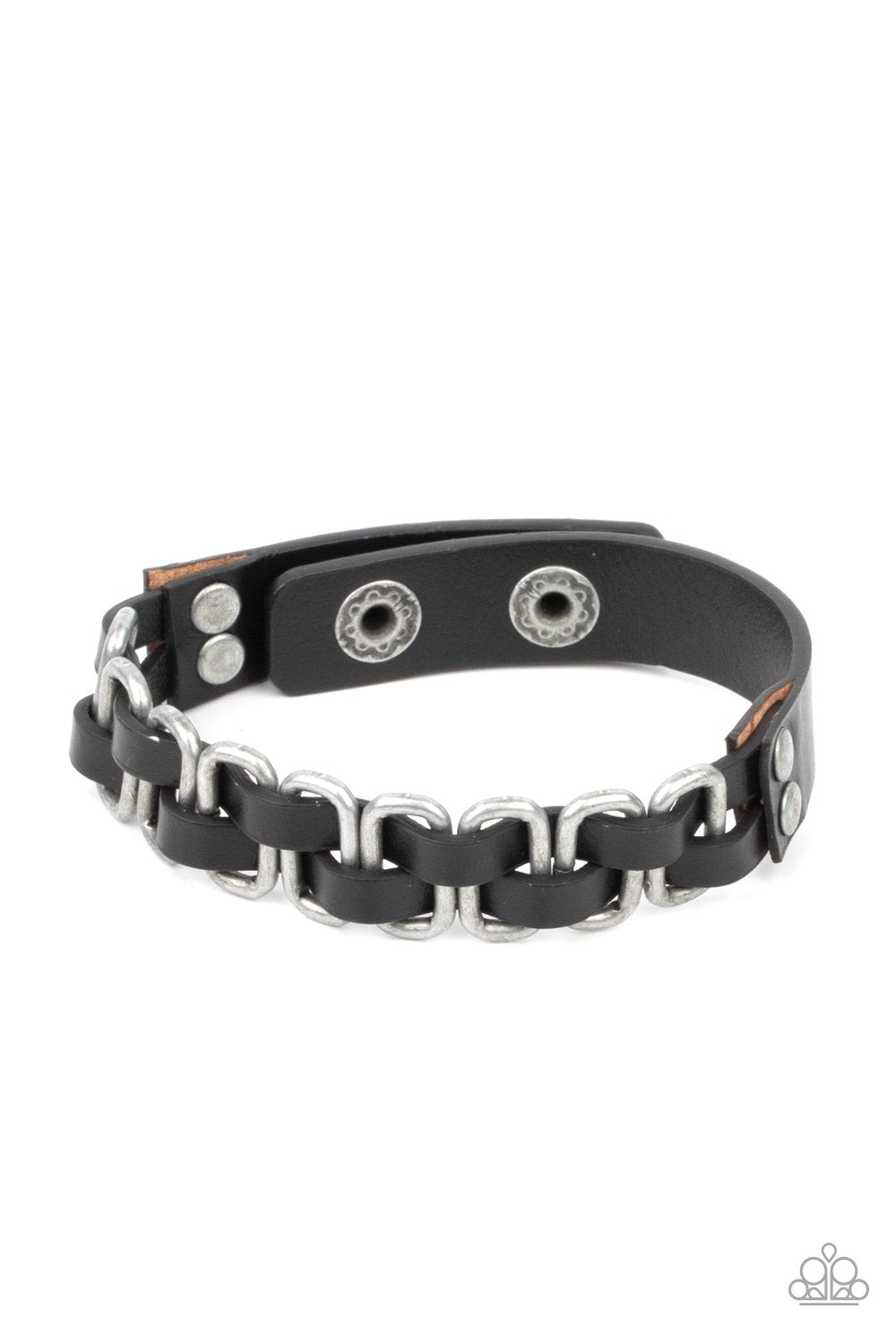 Two dainty black leather bands interweave between antiqued tin finished ovals, creating a rustic display around the wrist. Features an adjustable snap closure.