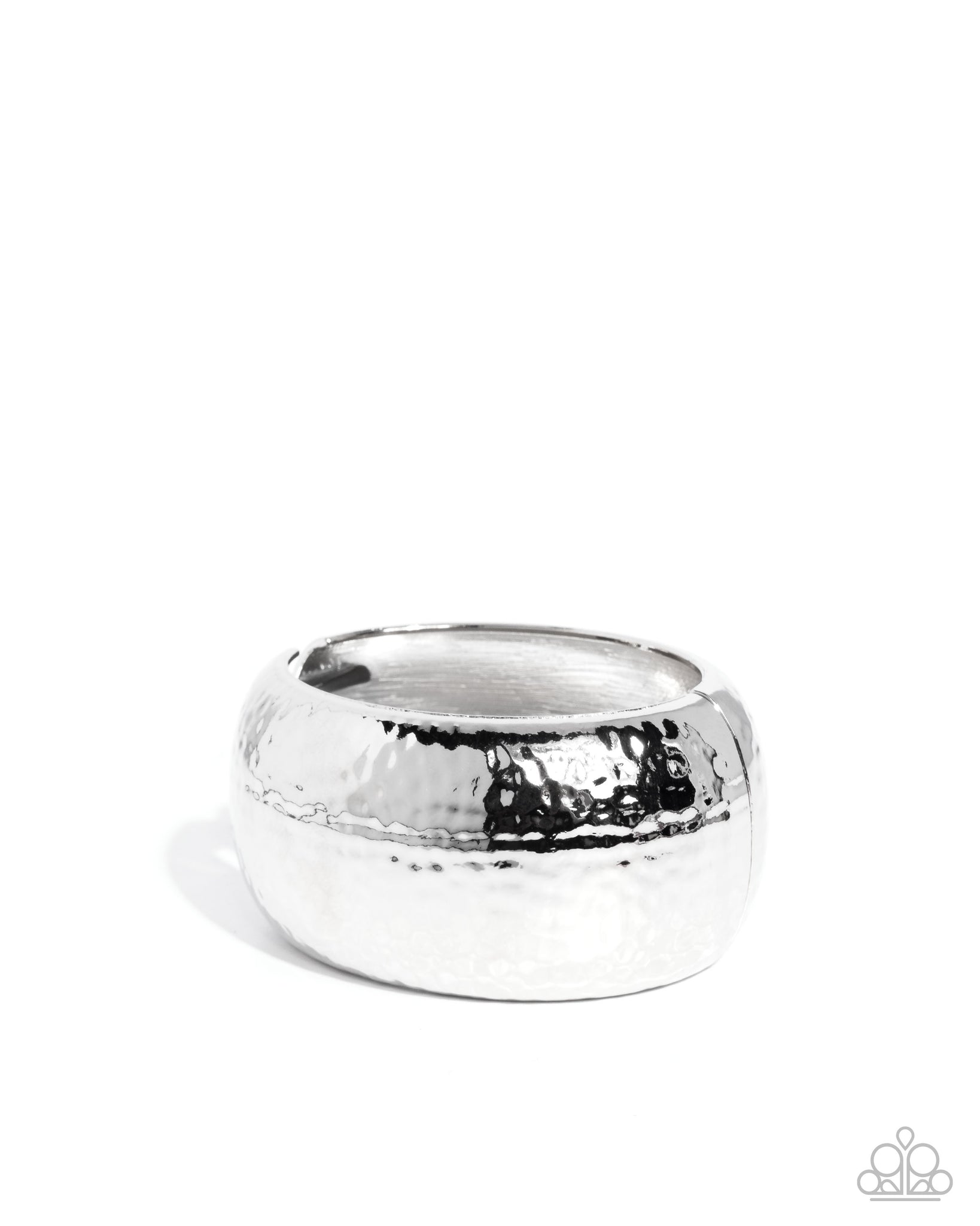 Featuring hammered detail, a shimmery silver cuff curls around the wrist for a bold pop of industrial inspiration. Features a hinged closure.