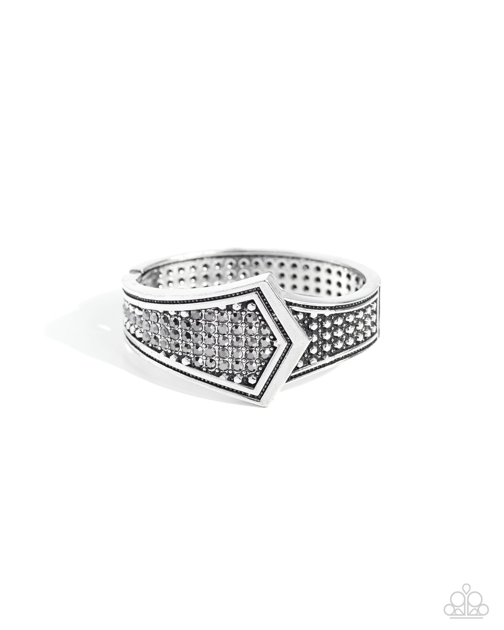 A thick band of silver in the shape of an abstract arrow is framed by thick borders that line its edges. The interior surface is filled with tiny silver studs, and a sprinkle of hematite mixed in as the silver bar flares out in a dramatic finish. Features a hinged closure.