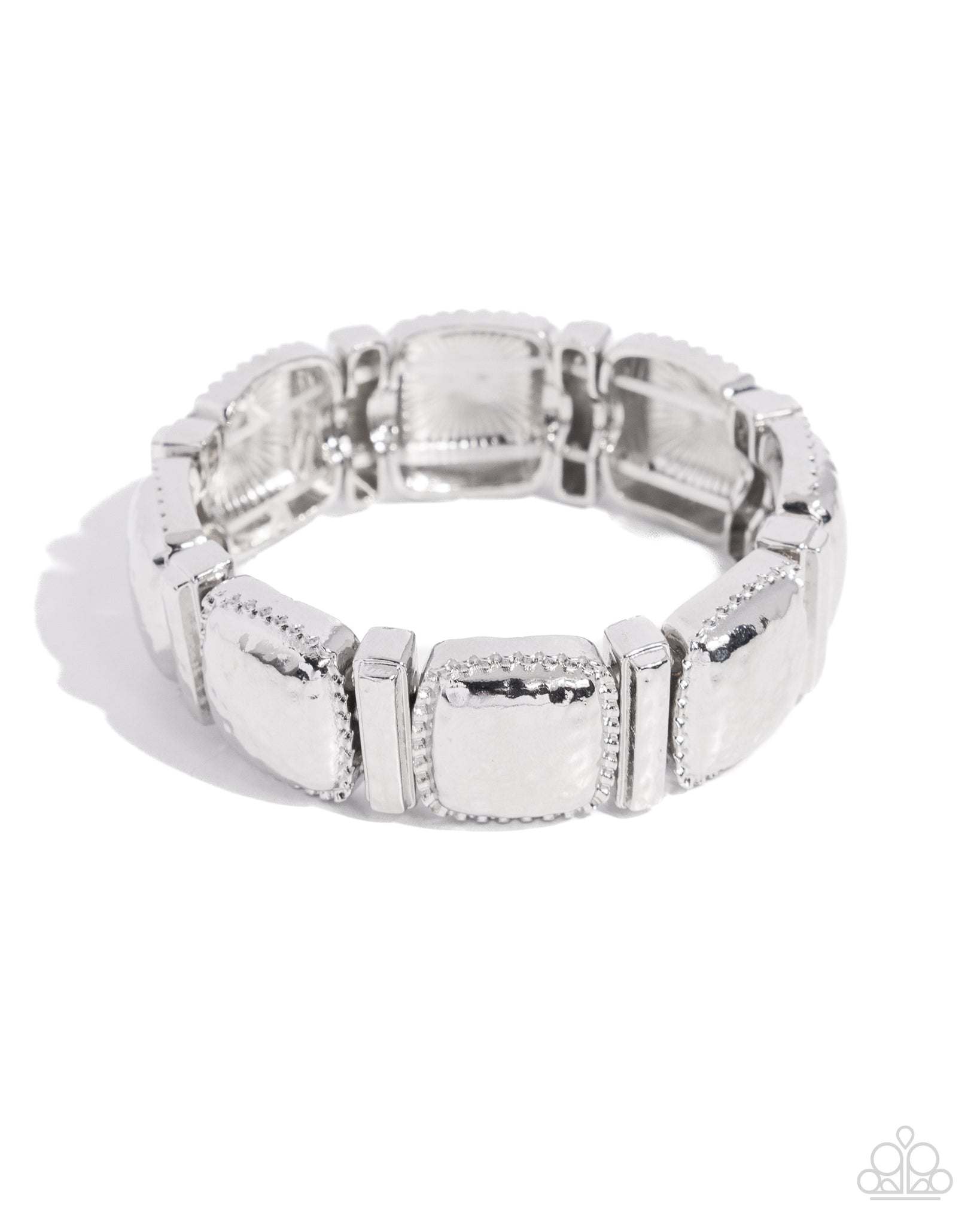 Featuring tactile textured frames, shiny silver squares alternate with skinny silver rectangles along the wrist on elastic stretchy bands for a high-sheen display of timeless texture.