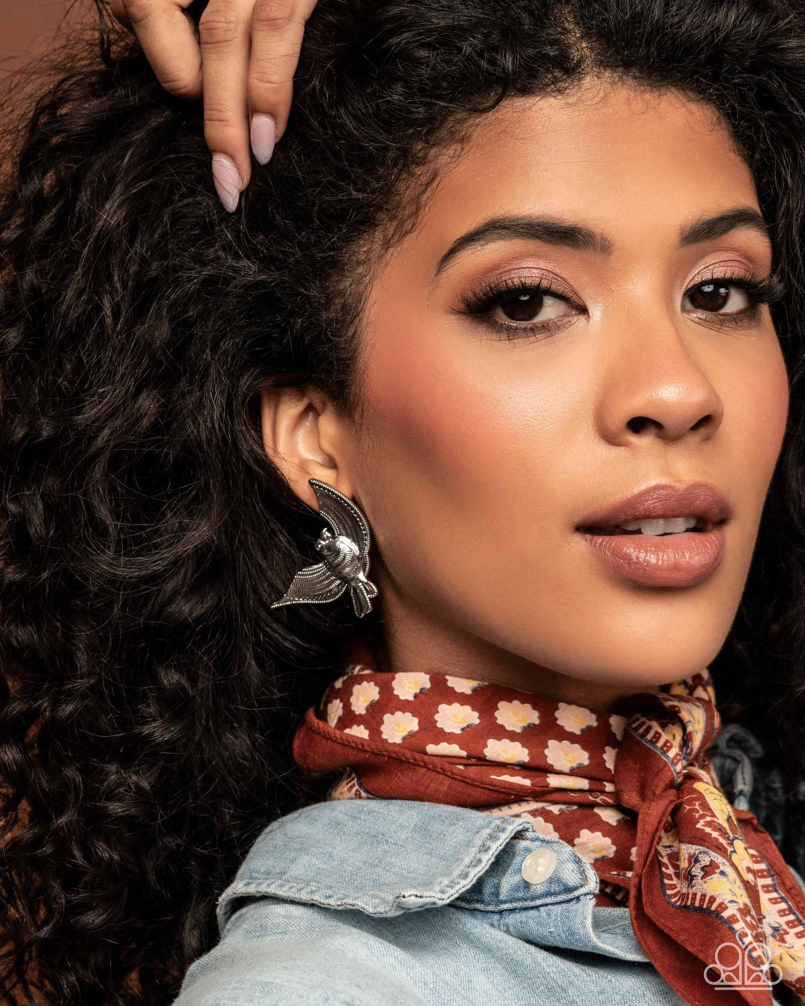 Featuring textured intricate detail, an oversized antiqued silver bird with its wings ready to take flight is perched atop the ear for a free-spirited look. Earring attaches to a standard post fitting.