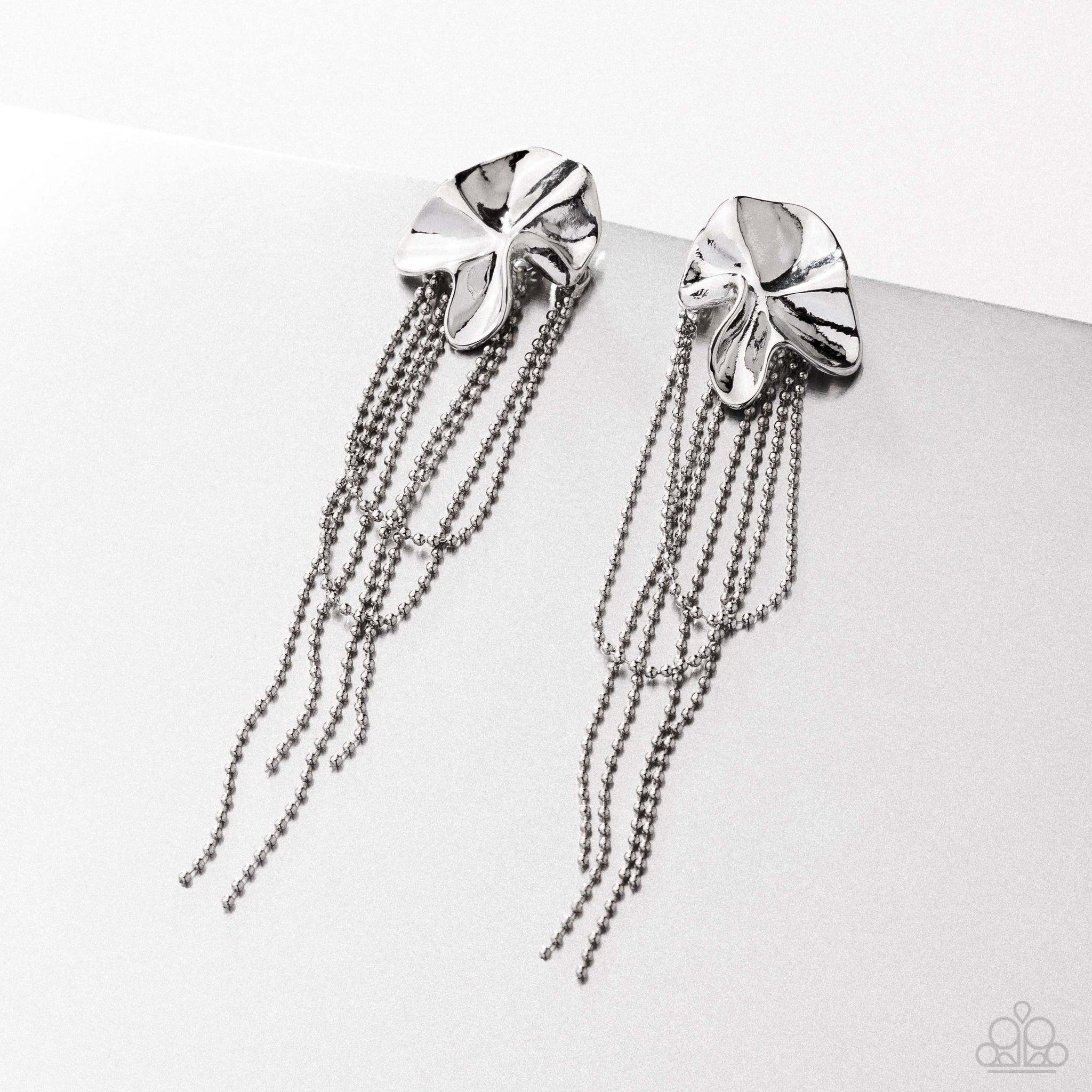 A sculpted floral motif rests atop the ear, crafted with a polished metallic finish for a modern touch. Cascading strands of dainty silver ball chains dangle elegantly from the base, creating dynamic movement and a statement-worthy silhouette. Earring attaches to a standard post fitting.