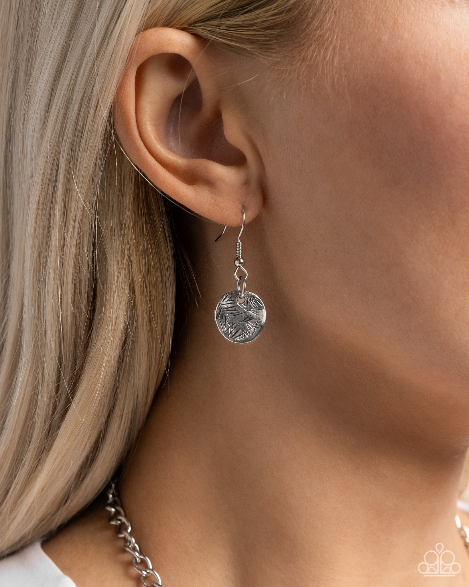 Infused on an elongated, three-layered silver chain, silver discs in varying sizes cascade down the chest. Some of the discs feature a hammered sheen while others feature a scratched linear texture for a dramatic display of grit and edge. Features an adjustable clasp closure.