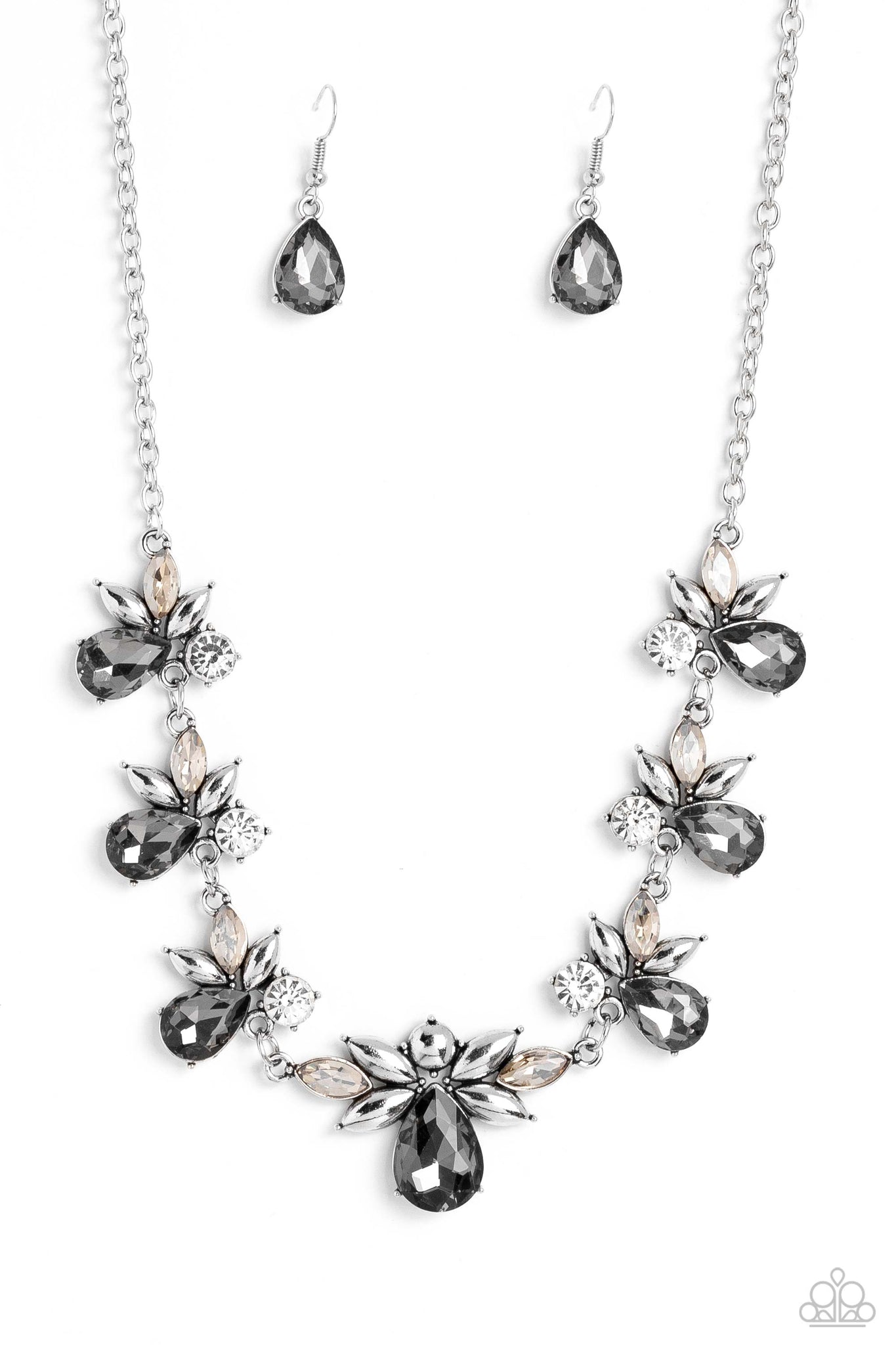 Smoky teardrops with explosions of white gems, and silver and white marquise-cut gems fanning around it, elegantly trickle into refined clusters along a shimmery silver chain, creating a timeless geometric palette. Features an adjustable clasp closure.