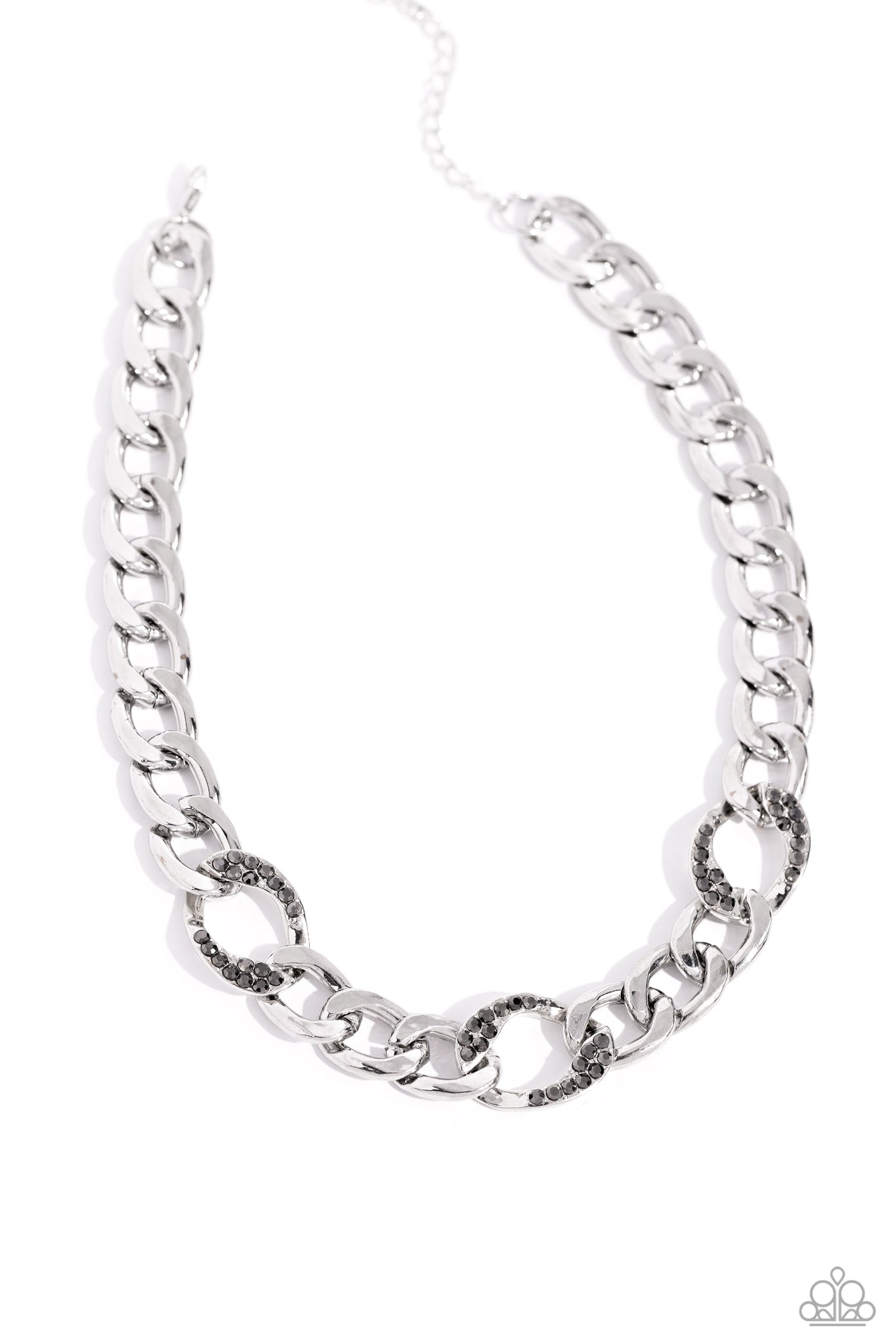 Dusted in hematite rhinestones, three oblong circle links combine with a strand of bold silver curb chain to drape dramatically across the chest. Features an adjustable clasp closure.