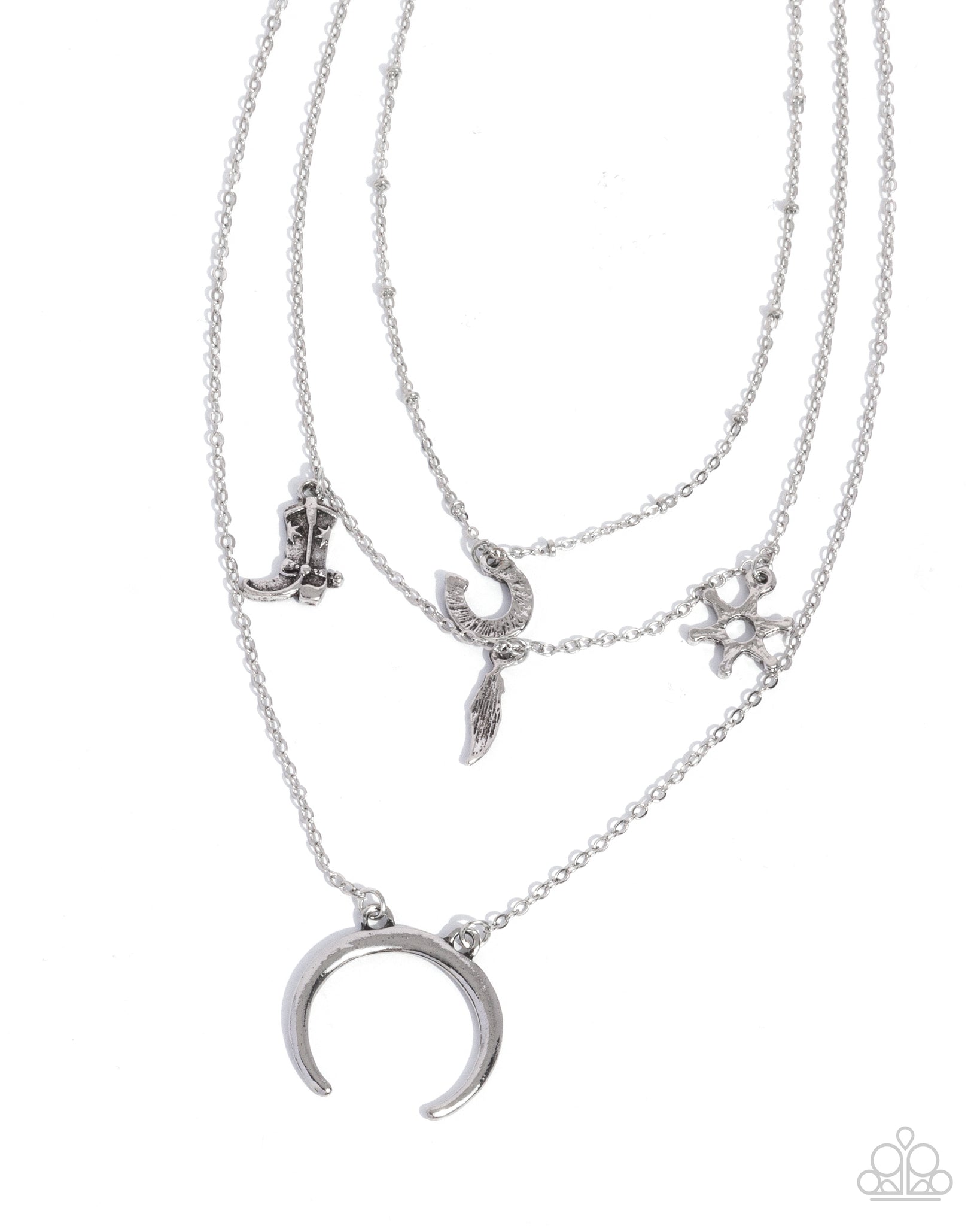 Gliding along layers of dainty and satellite silver chains, a collection of Western-inspired silver charms including a studded horseshoe, sheriff star, feather, detailed cowboy boot, and crescent horn create a cowboy chic cascade below the neckline. Features an adjustable clasp closure.