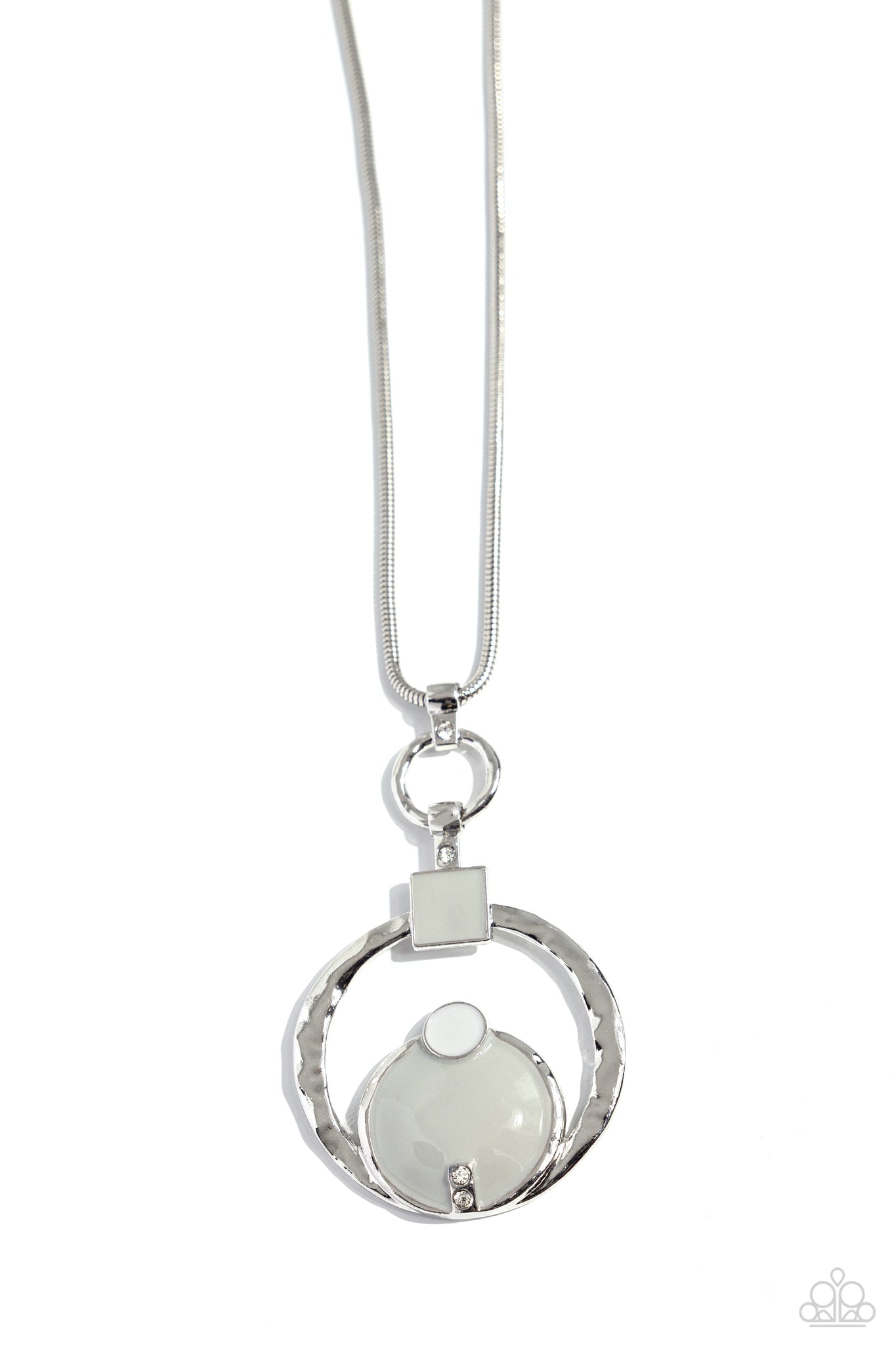 Gliding from a silver snake chain, a hammered silver disc gives way to a larger hammered silver disc featuring a gray-painted square at its top. A gray-painted circle with another smaller, gray-painted circle at its top rests at the bottom of the larger hammered ring. Glistening white rhinestones break up the hammered ring from the square and stack into the circle for a subtle touch of glitz. Features an adjustable clasp closure.