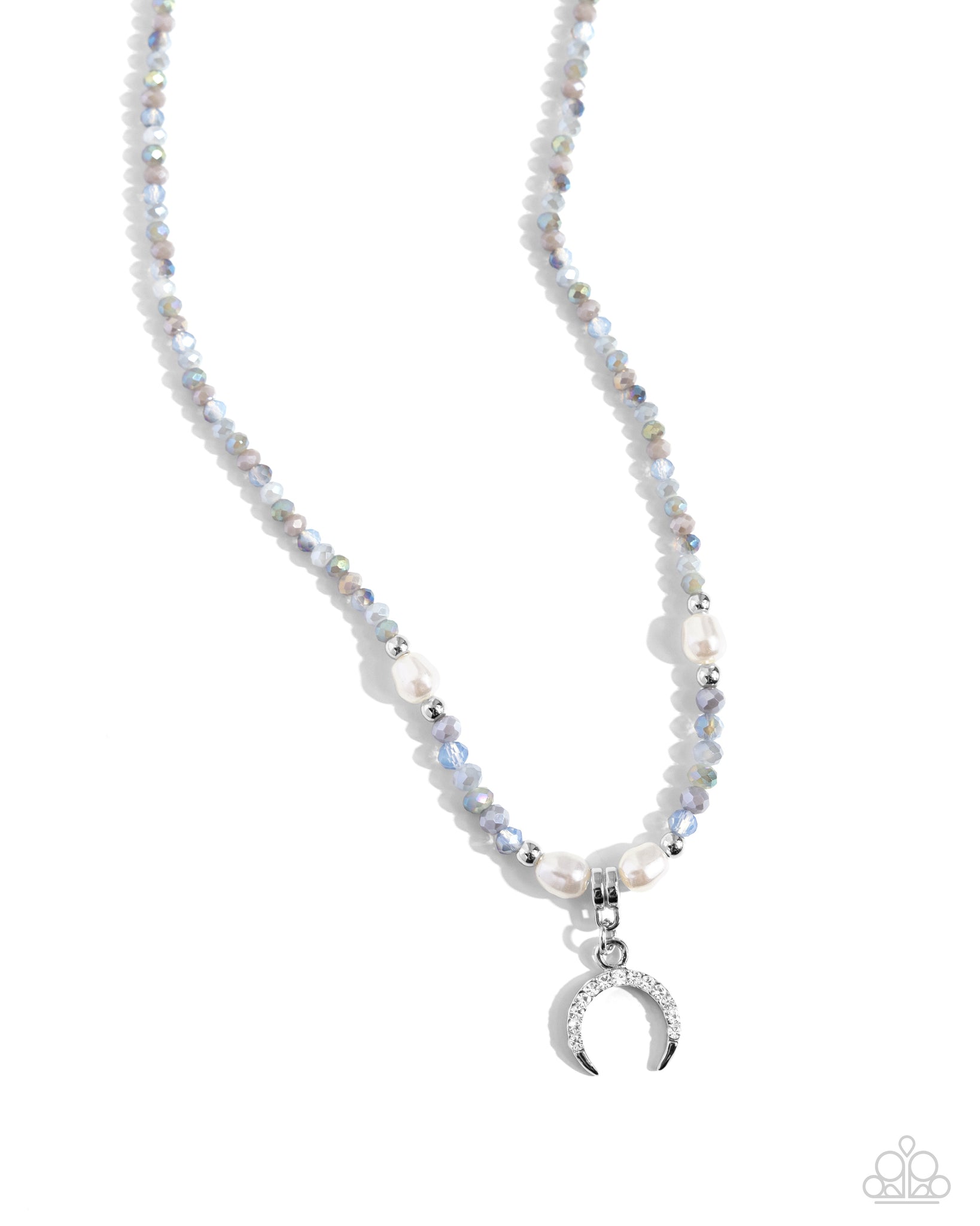 Infused along an invisible string, a collection of silver beads, baroque white pearls, and blue multicolored faceted beads coalesce around the neckline, leading the eye to a white rhinestone-encrusted silver crescent moon charm that is turned on its side for a sharply stunning statement. Features an adjustable clasp closure.