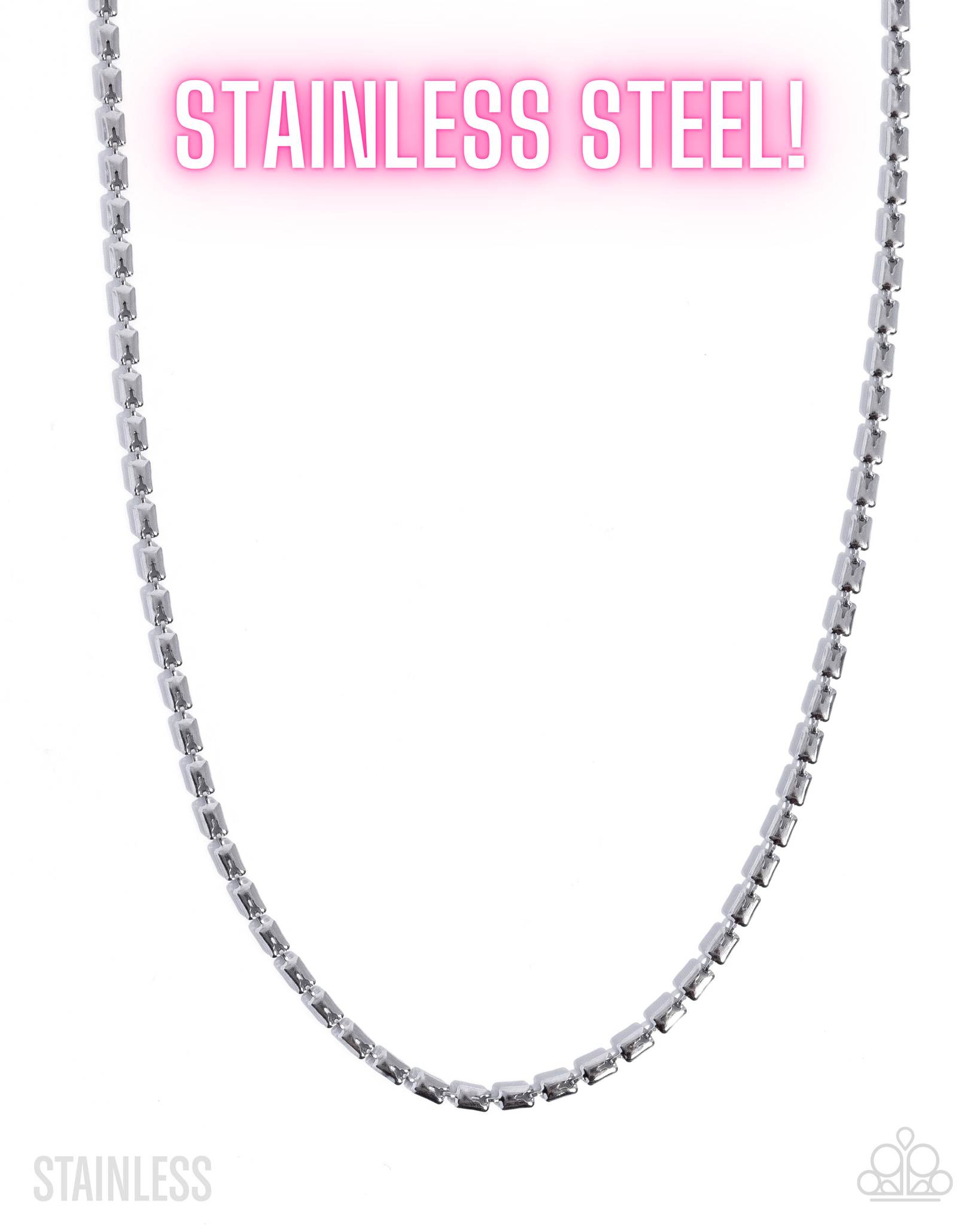 Featuring stainless steel, a glistening, oversized silver box chain cascades below the chest for a simple, serious look. Features an adjustable clasp closure.
