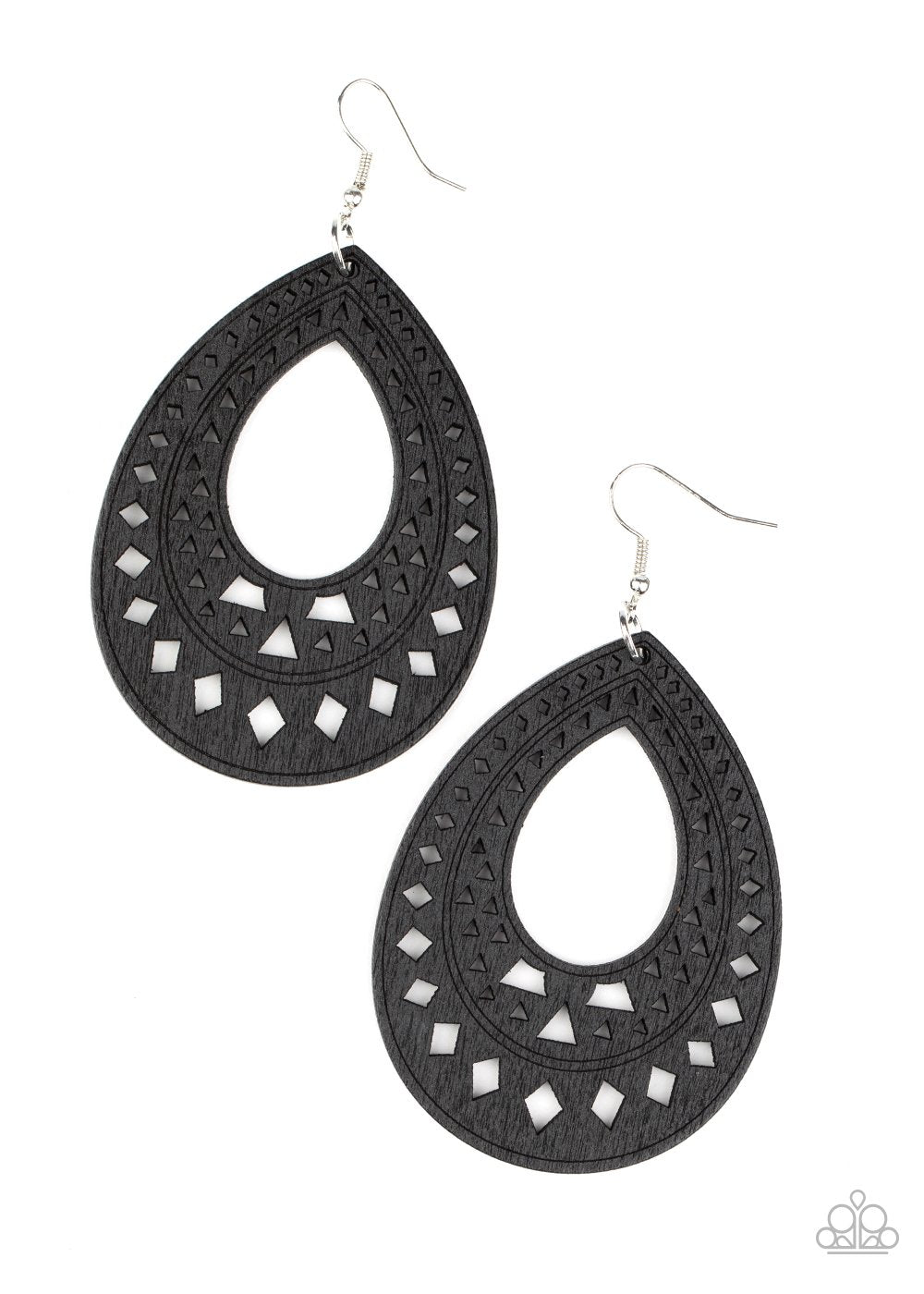 Painted in a neutral black finish, a wooden teardrop has been cut into a diamond and triangular stencil pattern for a tribal inspired flair. Earring attaches to a standard fishhook fitting.
