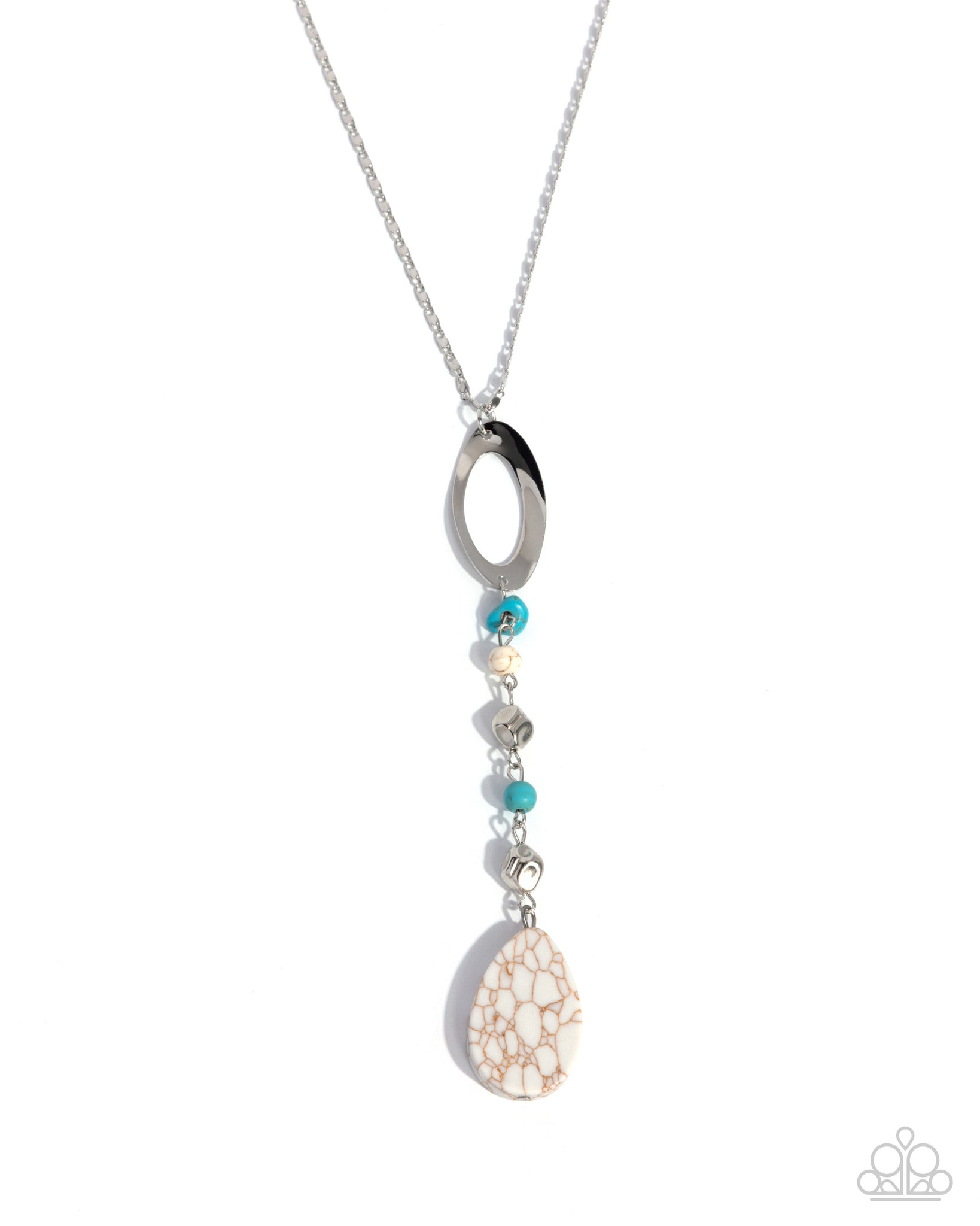 Infused along an abstract silver chain, a sleek silver oval glistens below the neckline giving way to an alternating pattern of baroque silver beads, marbled white, and turquoise stones, elongating into a white stone teardrop for an elegantly earthy look. Features an adjustable clasp closure. As the stone elements in this piece are natural, some color variation is normal.
