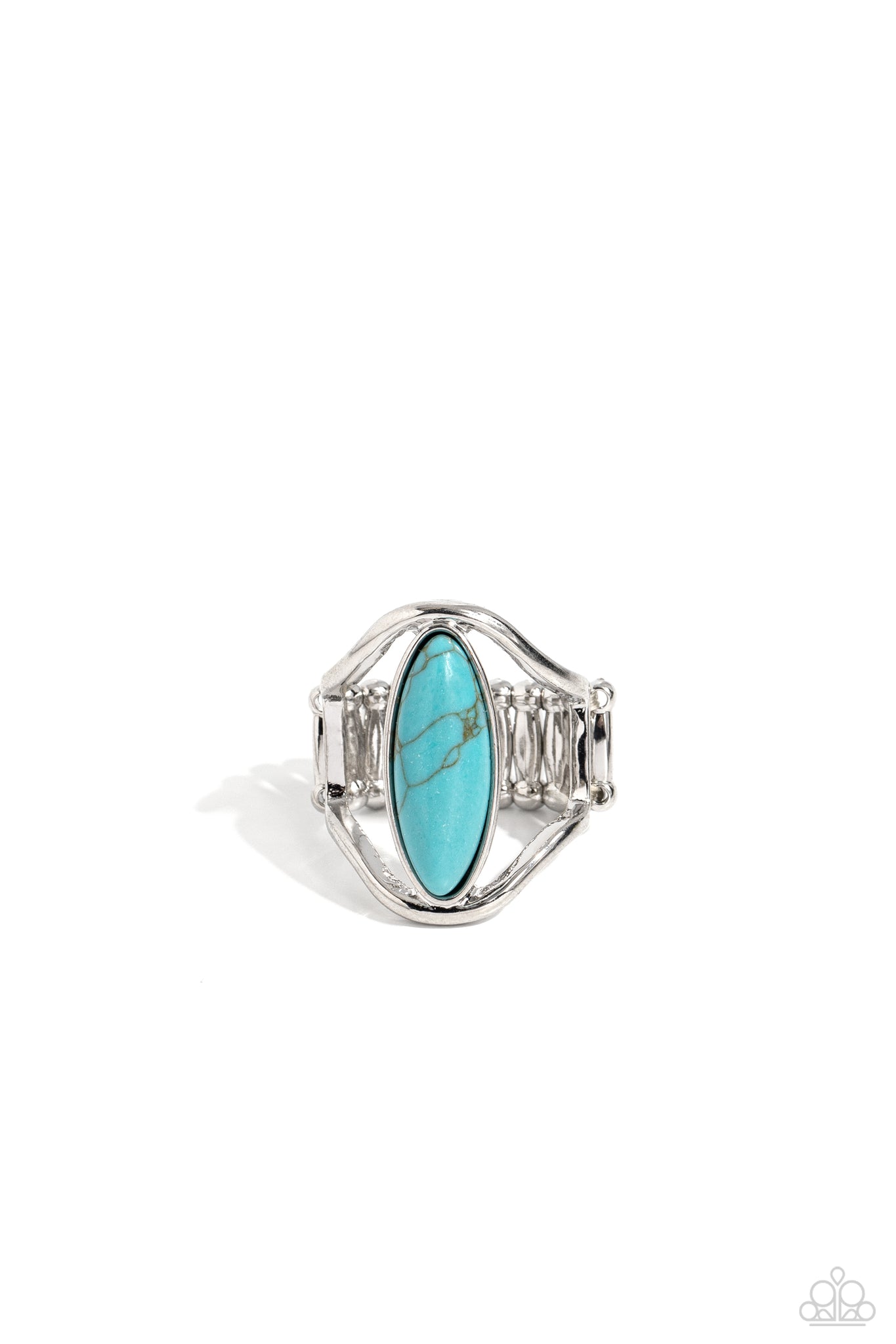 An elongated turquoise oval stone sits between two shiny silver bands that arc around it, creating the illusion of a floating southwestern centerpiece. Features a stretchy band for a flexible fit. As the stone elements in this piece are natural, some color variation is normal.