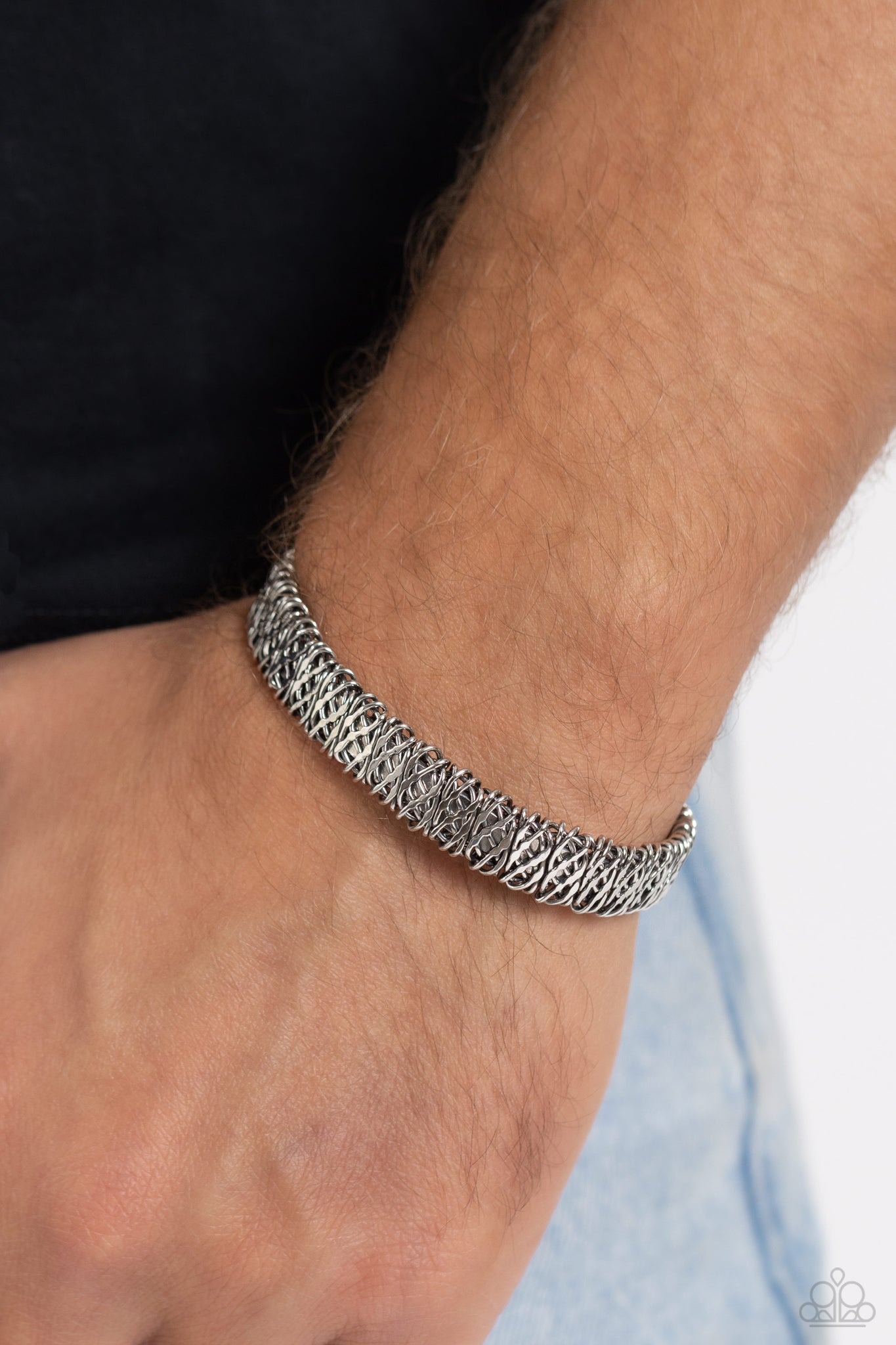 Braided across the entirety of a high-sheen silver cuff, thin silver bars form a filigree collection across the wrist for a high-impact urban statement.