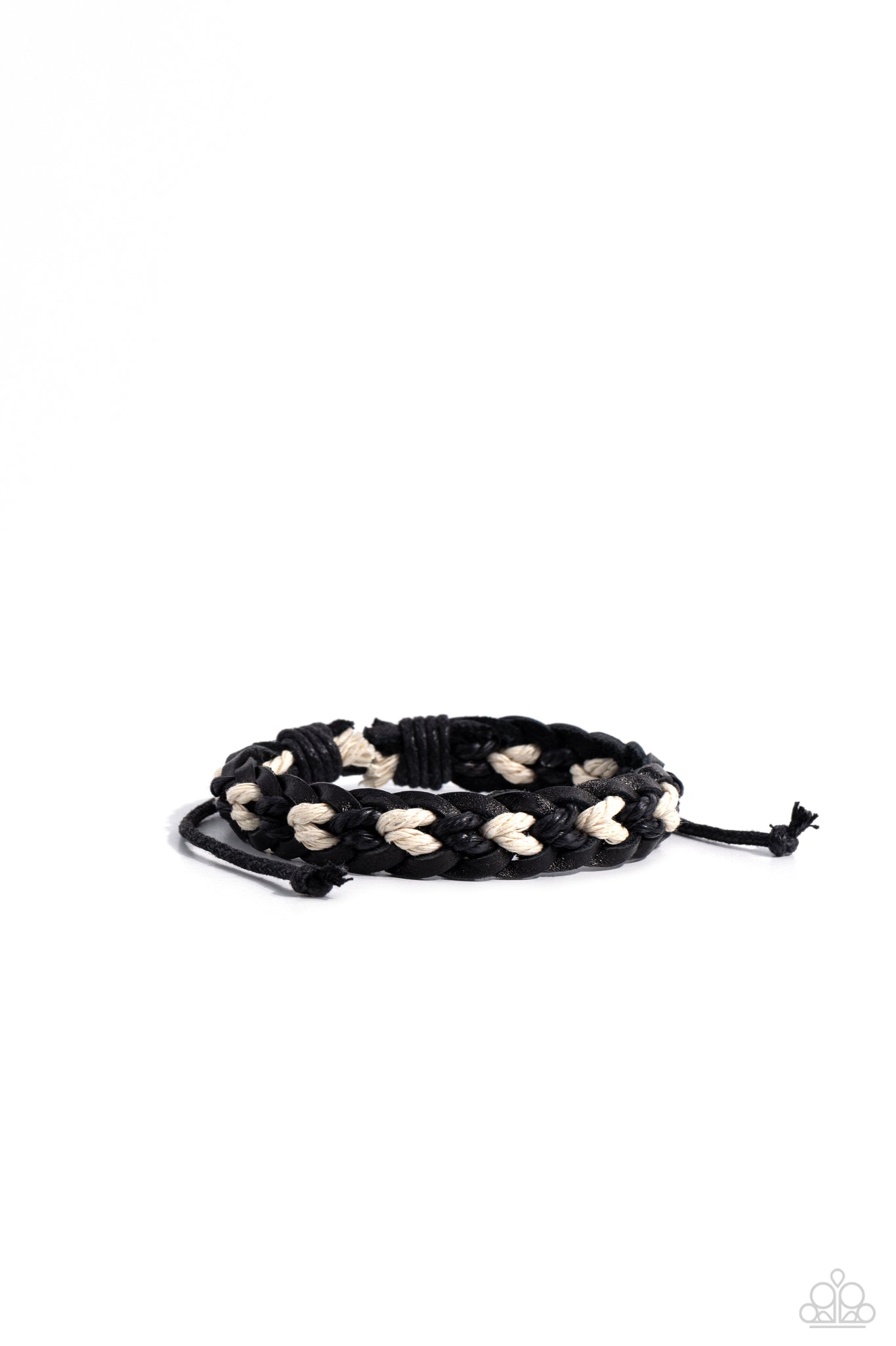 Black leather laces knot with white and black cording around the wrist, weaving into a colorful braid for an adventurous vibe. Features an adjustable sliding knot closure.