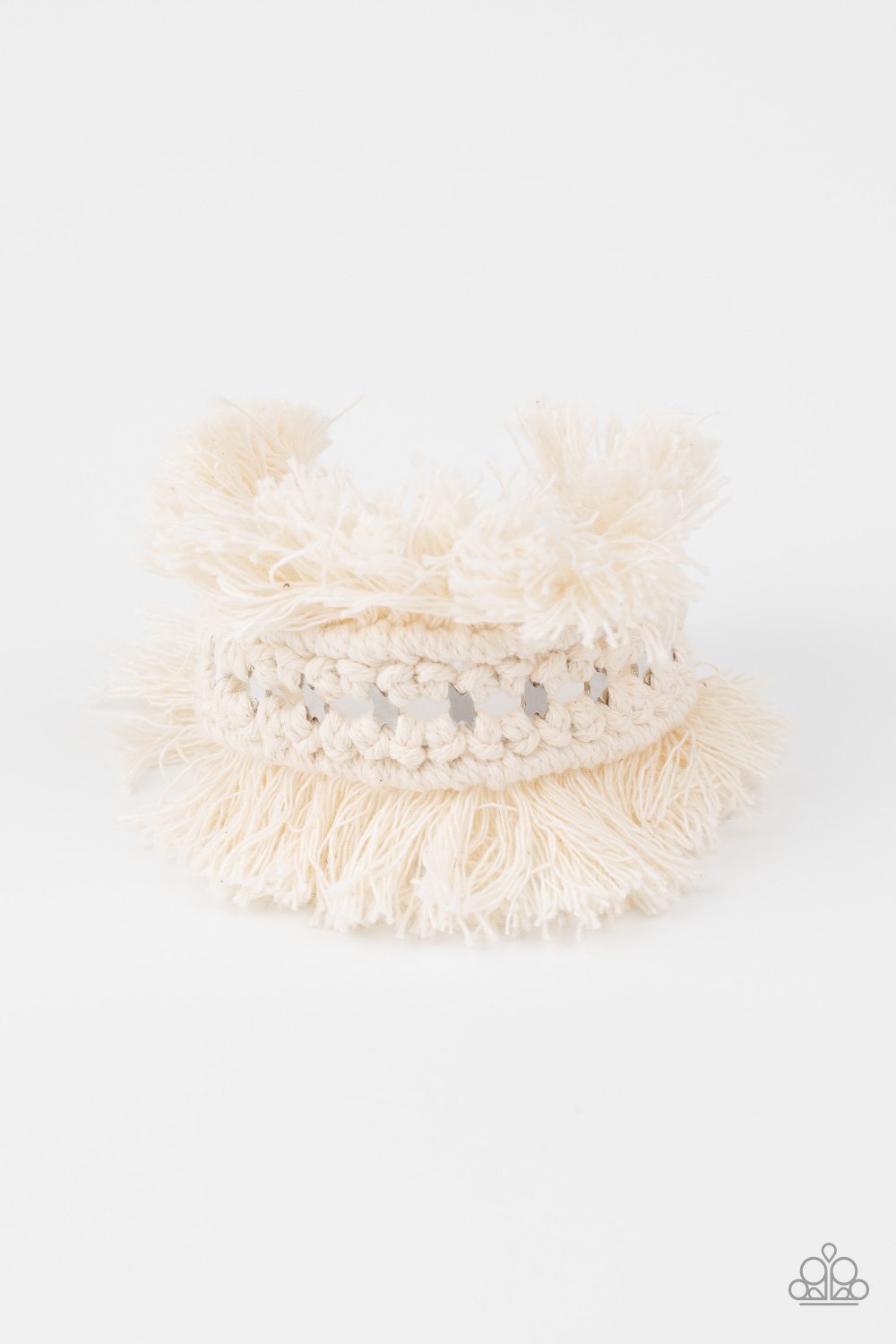 Twine-like thread decoratively knots around an airy silver cuff, creating a macramé inspired fringe around the wrist.