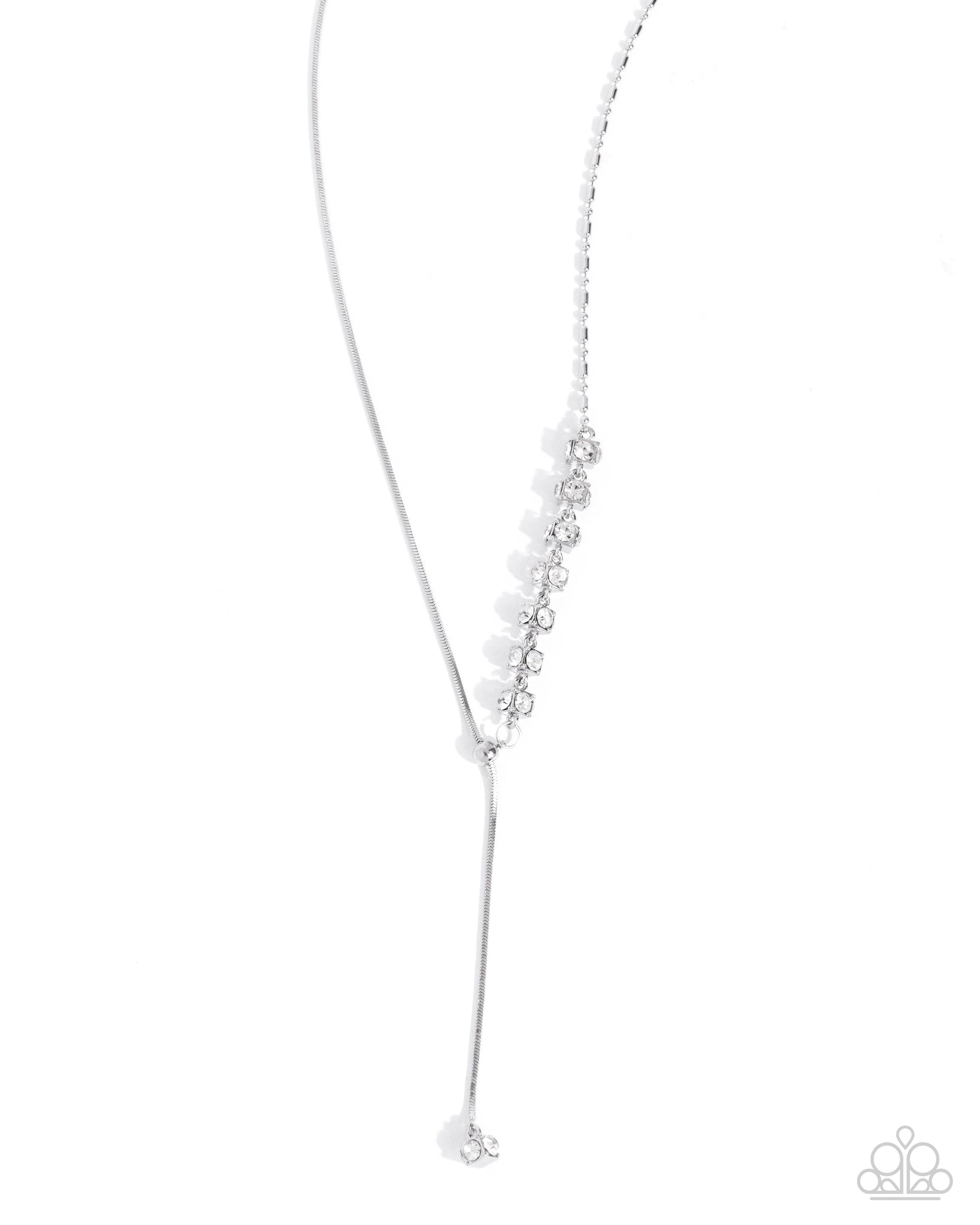 Attached to a ball-and-bar silver chain, a collection of white rhinestone-embellished silver cubes is attached to a solitaire silver bead that glides along a silver snake chain, creating an adjustable, awe-inspiring lariat of glitzy geometrics. An additional rhinestone-embellished silver cube glistens from the bottom of the snake chain for additional shimmer.