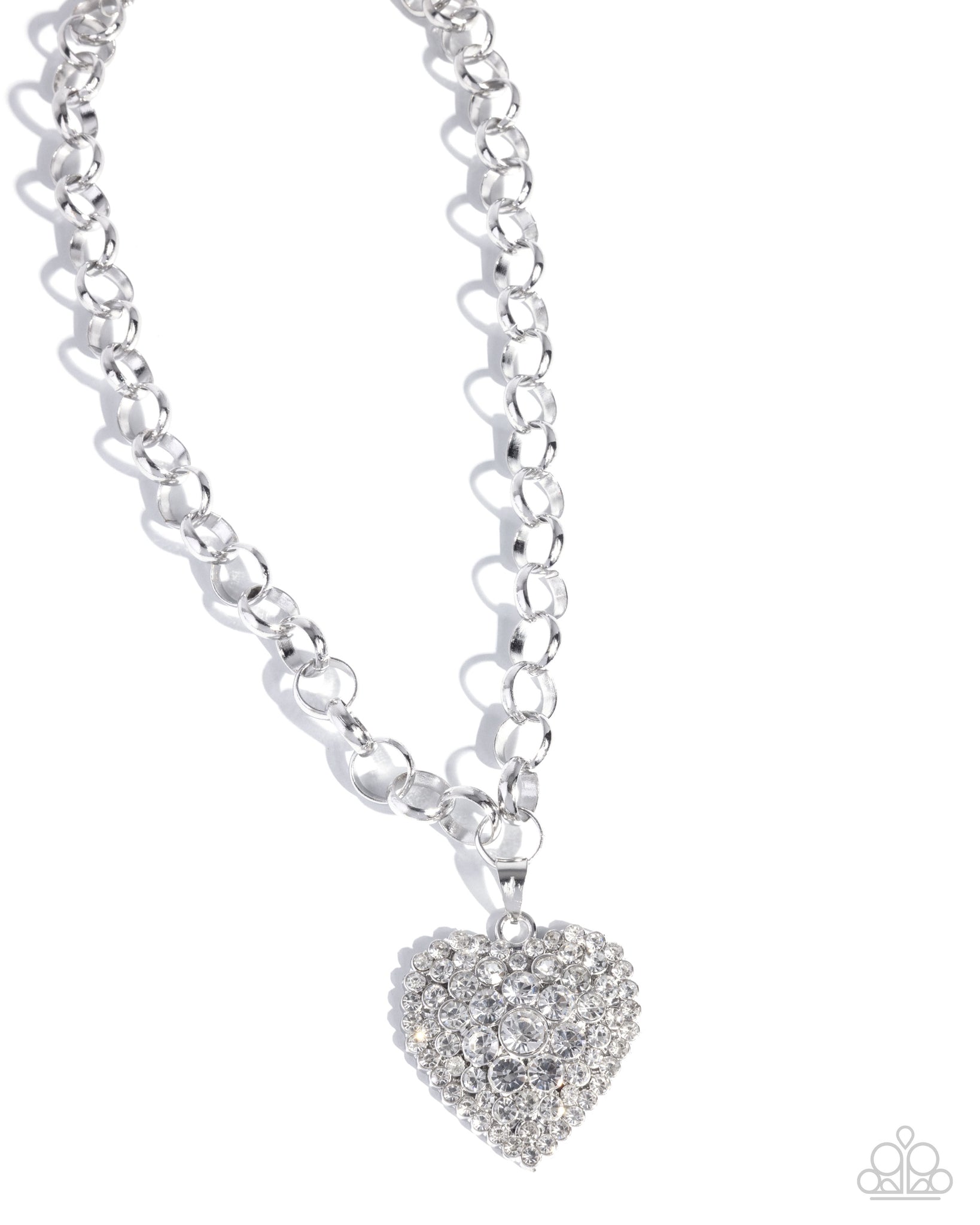A cluster of dazzling white rhinestones creates a glamorous heart-shaped pendant that swings from oversized silver links, creating a bold and radiant design. The brilliant white rhinestones gradually increase in size as they reach the center. Features an adjustable clasp closure.