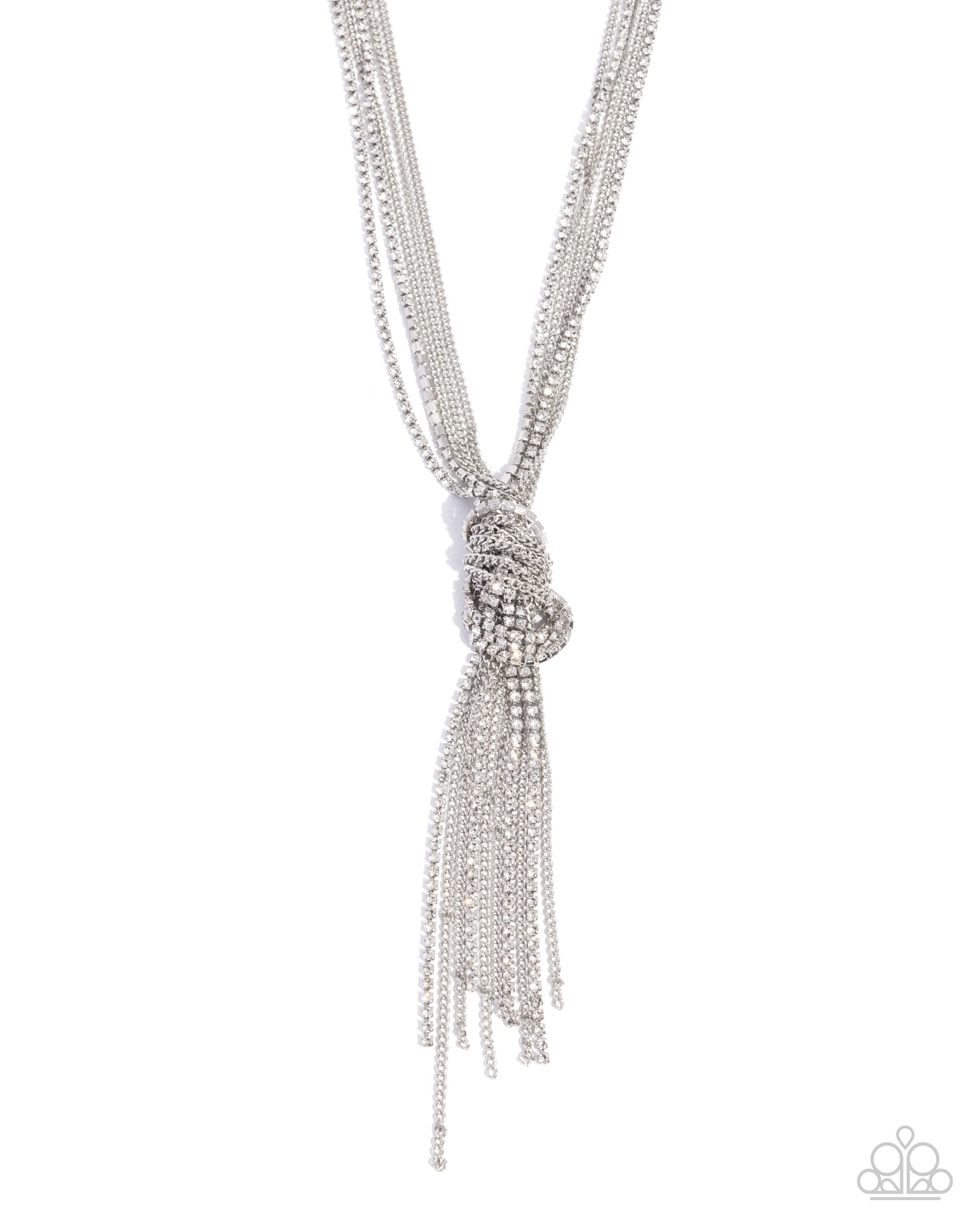 Strands of glistening, classic silver chains join strands of white rhinestones in silver square fittings in varying sizes, pulled together in a sassy knot at the center of the chest, creating a show-stopping fringe tassel. Features an adjustable clasp closure.