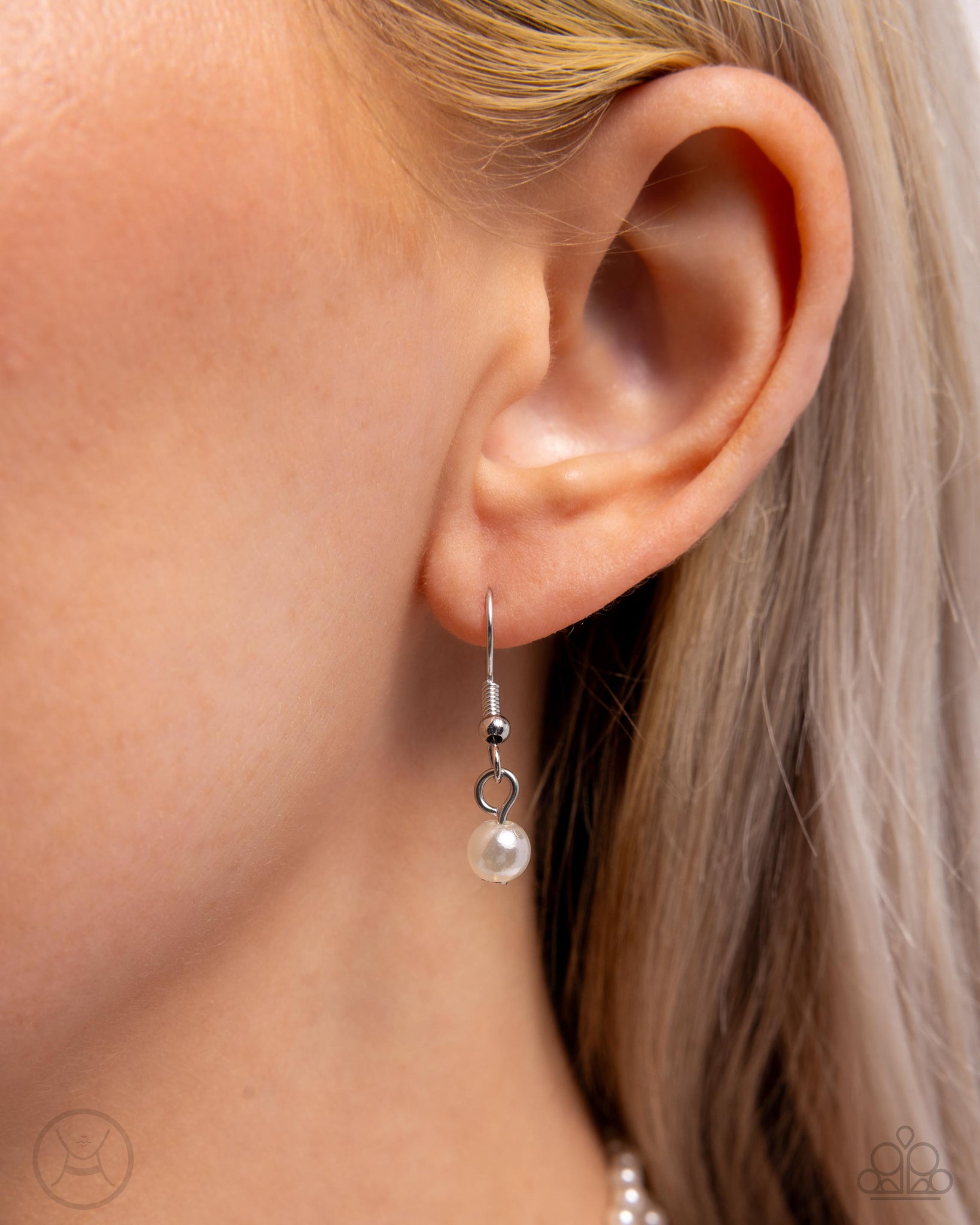 A duo of white rhinestones in silver square fittings collides with layers of white pearls to create a refined blend of color and glitz along the collar. The sleek rhinestones are tied around the bubbly pearls linking through additional white rhinestone-dusted square fittings, perfectly balancing the contrasting design. Features an adjustable clasp closure.