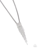 Embellished in row after row of glistening white rhinestones, a rectangular fitting glitters below the neckline giving way to strands of additional white rhinestones, creating a tapered fringe at the bottom of a sleek silver herringbone chain. Features an adjustable clasp closure.