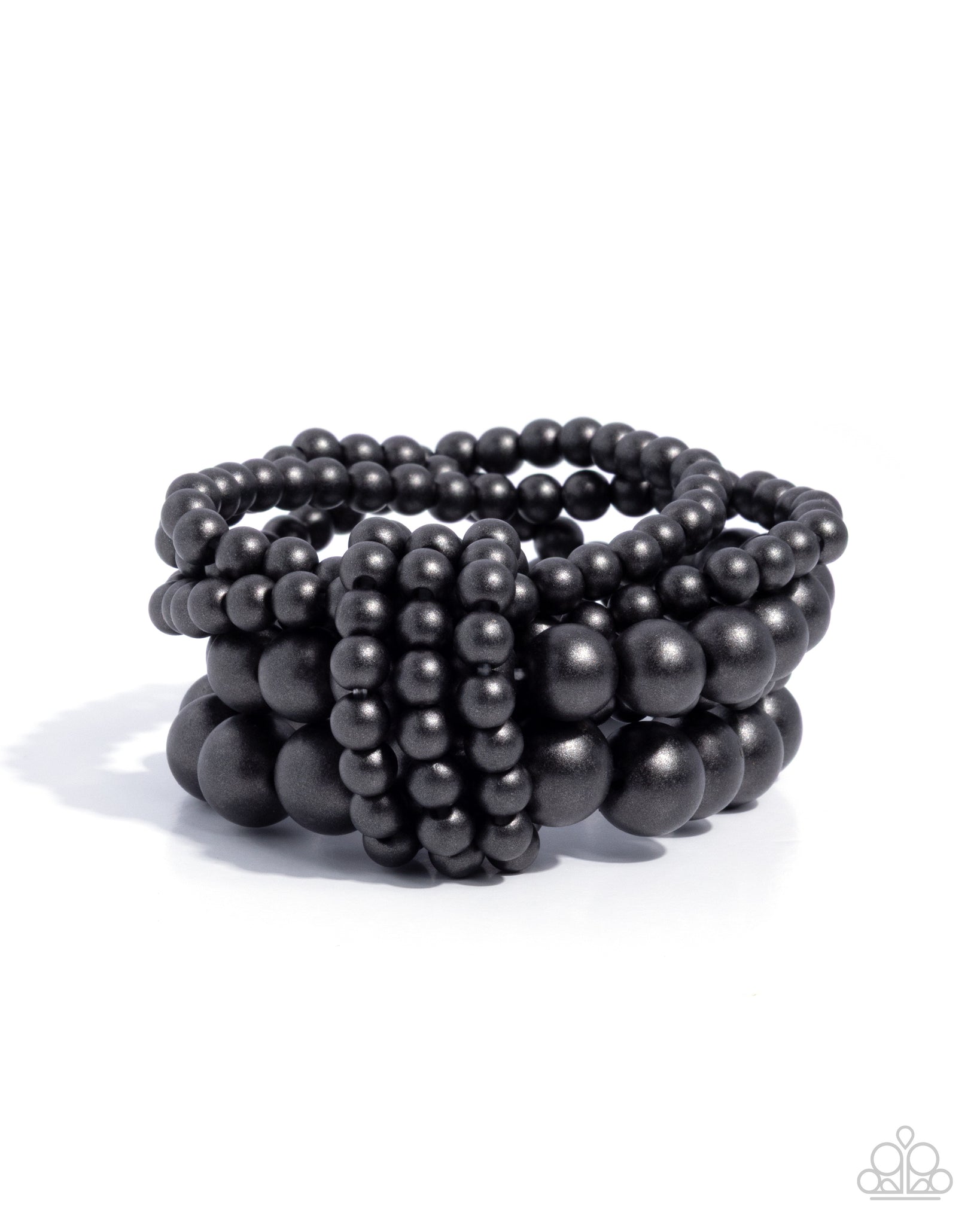 Featuring a polished finish, a collection of black wood beads in varying sizes stacks along the wrist along elastic stretchy bands for a rustic pop of color.