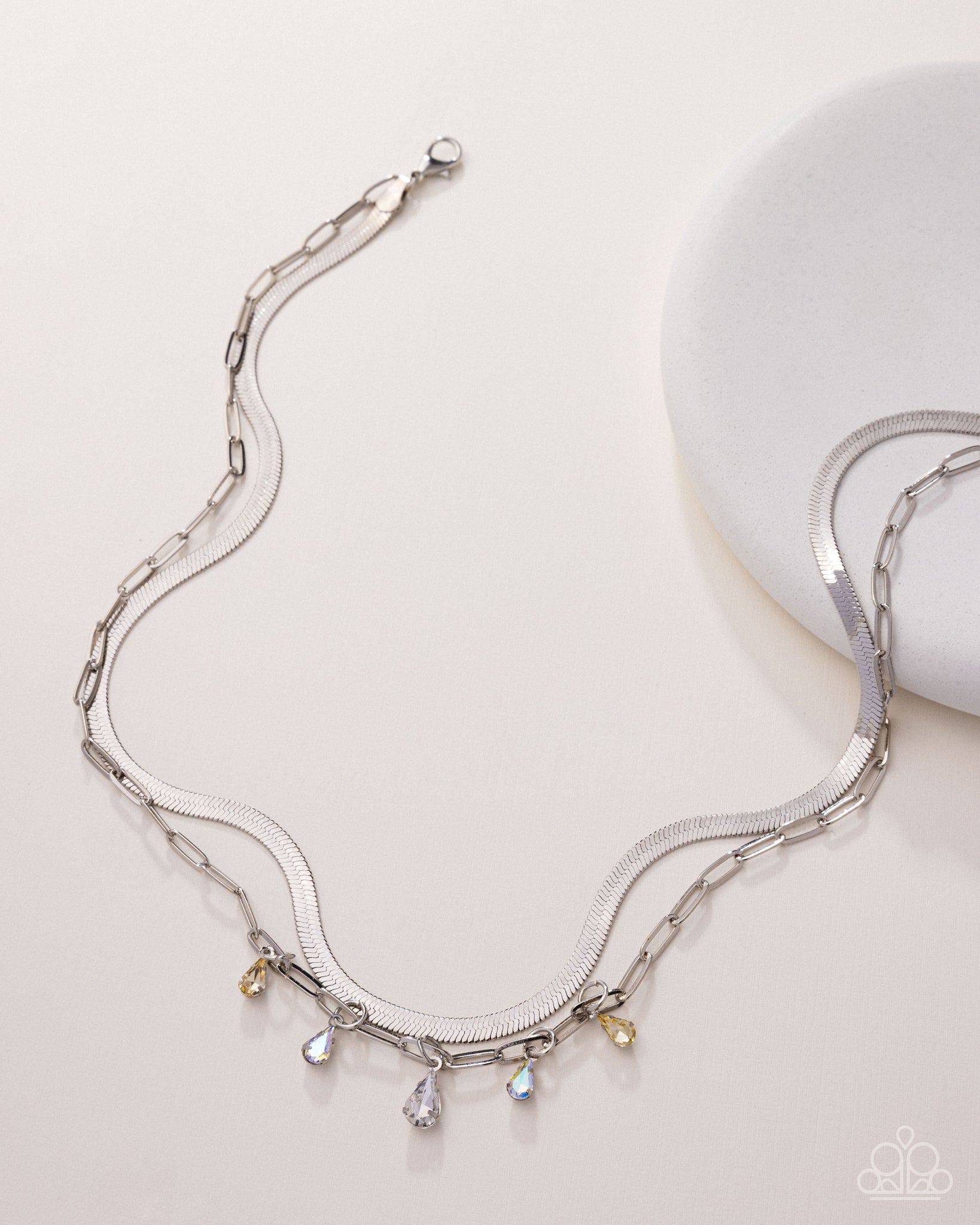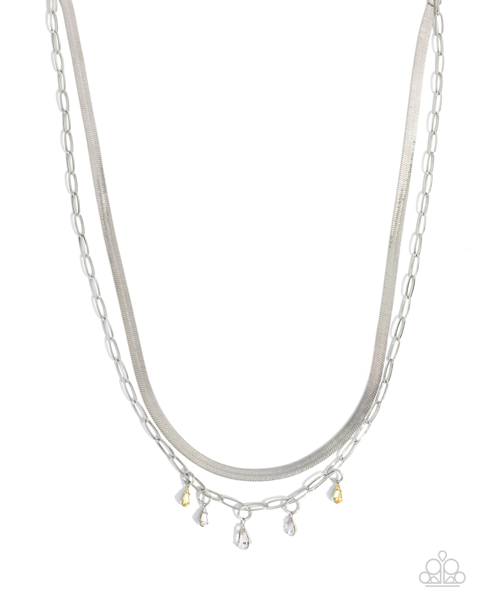 Pressed in pronged, silver frames, a collection of dainty white, yellow, and yellow iridescent teardrop gems sway from a silver paperclip chain that joins a silver herringbone chain for a luminescent layered look. Features an adjustable clasp closure. Due to its prismatic palette, color may vary.