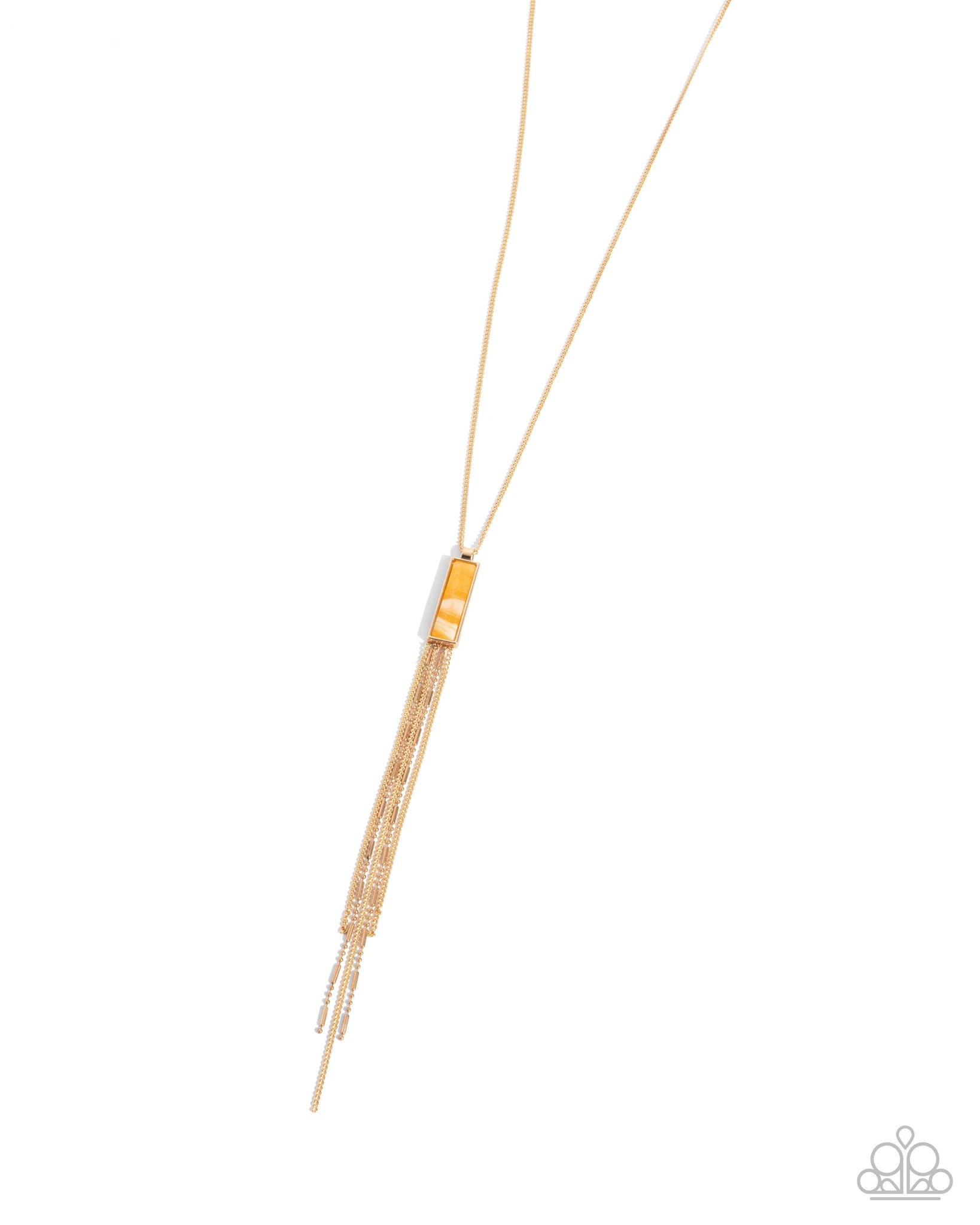 Gliding along a classic gold chain, a yellow multicolored-striped rectangular stone is pressed in a thin gold frame giving way to a tassel of cylinder-infused ball and classic gold chains for an eye-catching, earthy eclectic display. Features an adjustable clasp closure. As the stone elements in this piece are natural, some color variation is normal.