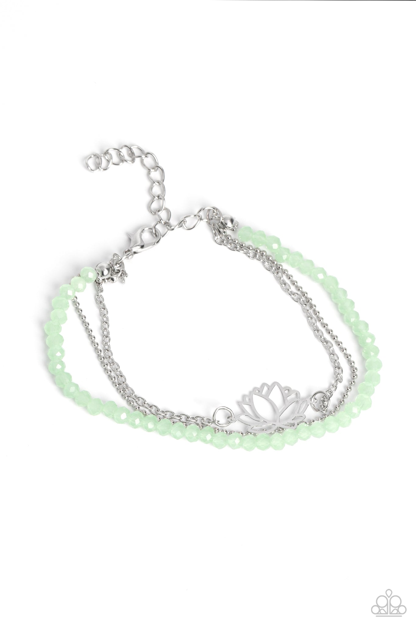 Faceted green beads combine with a dainty silver chain, and a dainty silver ball chain for a colorful display around the wrist. Falling from the classic chain, an airy silver lotus blooms, adding a whimsical floral display to the design. Features an adjustable clasp closure.