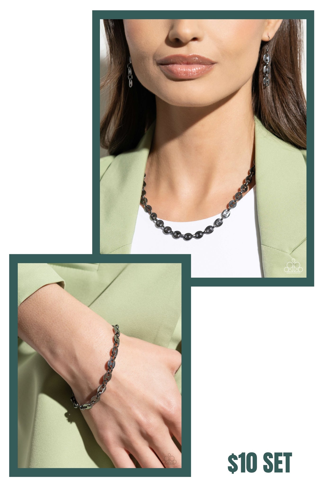 NECKLACE: Resembling soda can tabs, an abstract gunmetal chain interlocks around the collar for an industrial look. Features an adjustable clasp closure.
