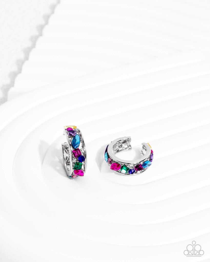 Encrusted along the front of an airy silver cuff, a collection of multicolored gems and rhinestones in square, round, emerald-cut, marquise-cut, and teardrop shapes curl around the ear in an adjustable, one-size-fits-all manner for a shimmery statement.