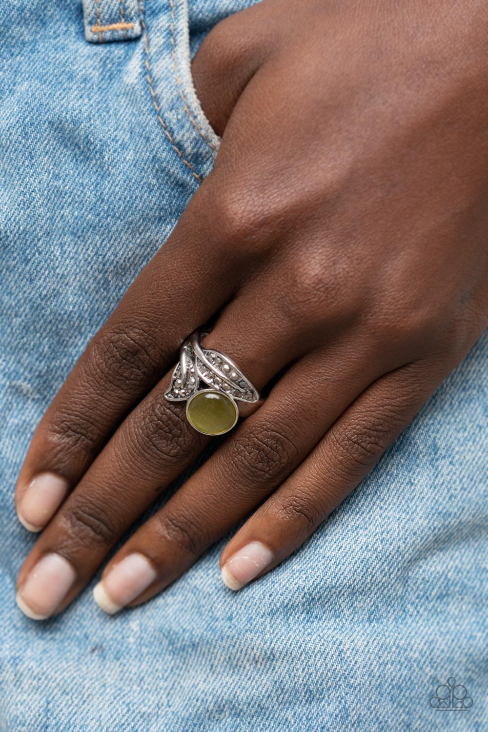 Hematite rhinestone encrusted silver leaf frames delicately gather around a dreamy Olive Branch cat's eye stone, resulting in an ethereal centerpiece atop the finger. Features a dainty stretchy band for a flexible fit.