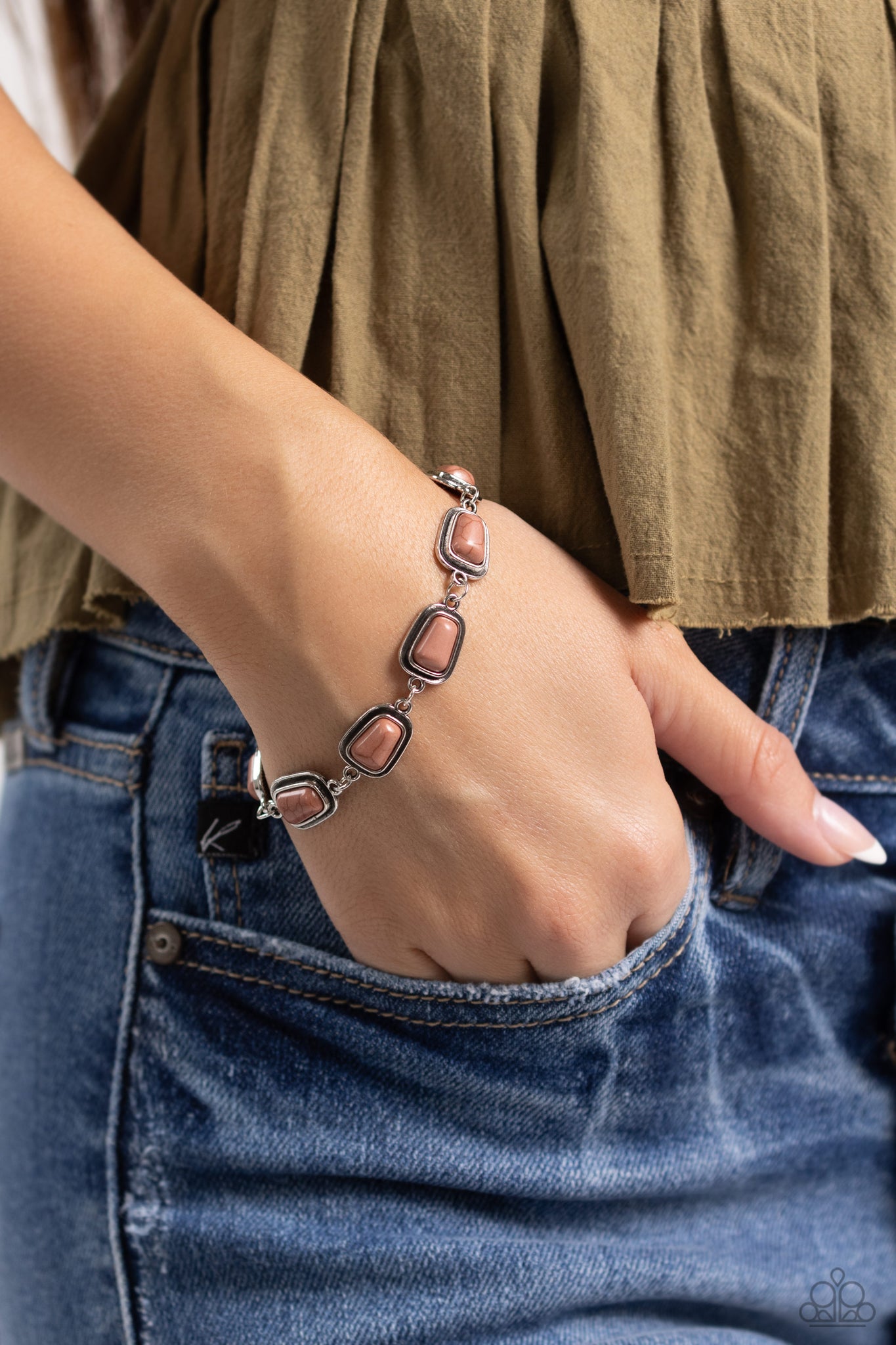 Encased in silver fittings, trapezoidal meerkat stones delicately fan out around the wrist for a dramatic pop of color. Features an adjustable clasp closure. As the stone elements in this piece are natural, some color variation is normal.