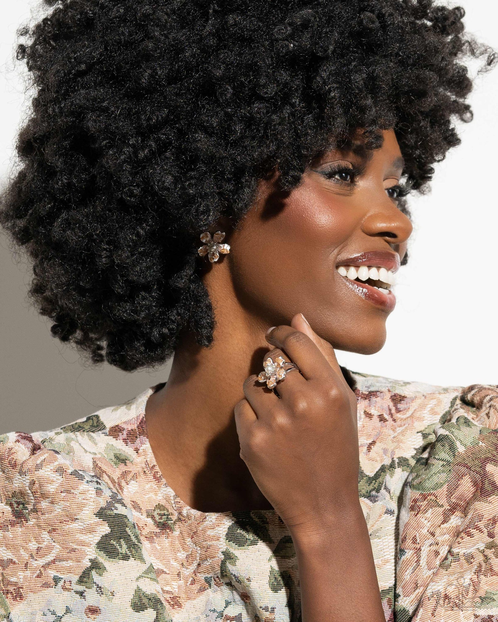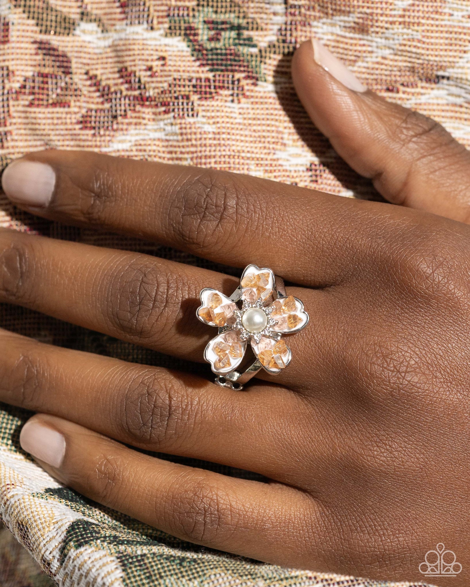 RING: Chiseled Captain • Brown P4RE-BNXX-214YX: A collection of chiseled Brush gems are encased inside a glassy, floral silver casing, painted in white, around a glossy white pearl and white rhinestone center, creating a whimsical standout centerpiece atop airy silver bands. Features a dainty stretchy band for a flexible fit.