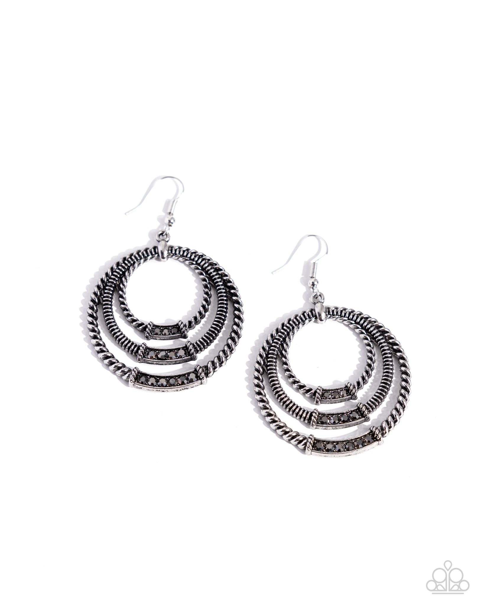 Increasing rows of hematite rhinestones adorn the centers of a mismatched trio of twisted silver hoops, rippling into a gritty and dizzying display of dazzle. Earring attaches to a standard fishhook fitting.