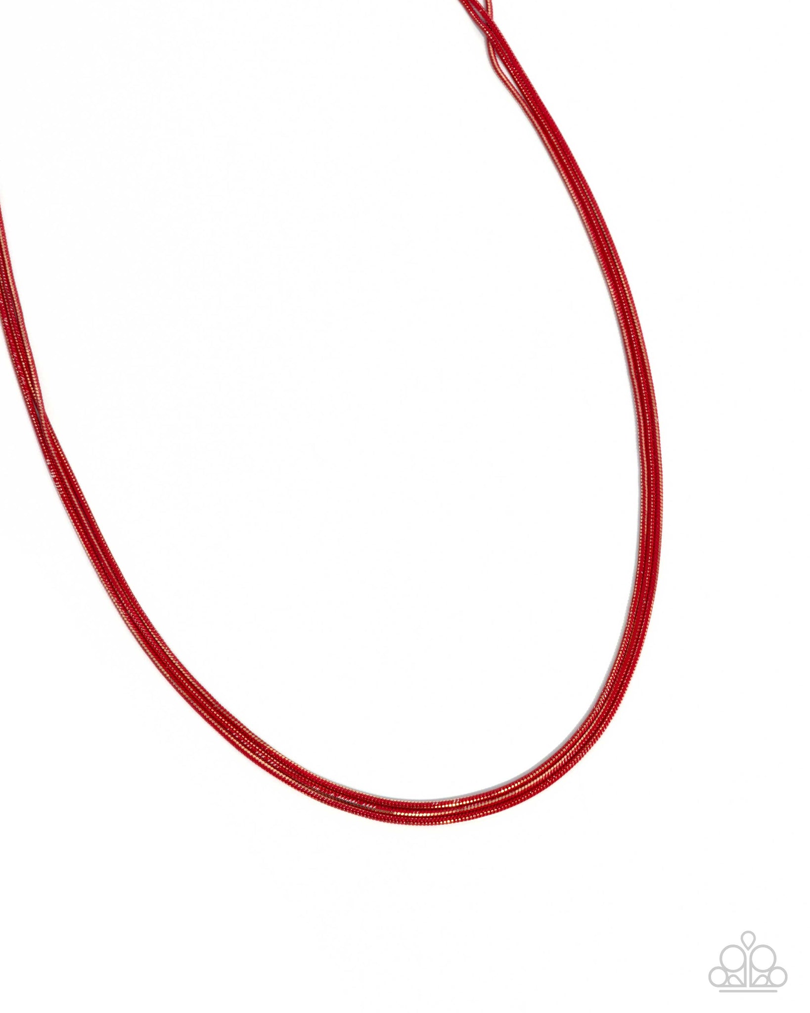 NECKLACE: Featuring shiny gold and red links, slim snake chains drape across the chest from gold cap fittings, for an edgy mixed metallic finish below the neckline. Features an adjustable clasp closure.
