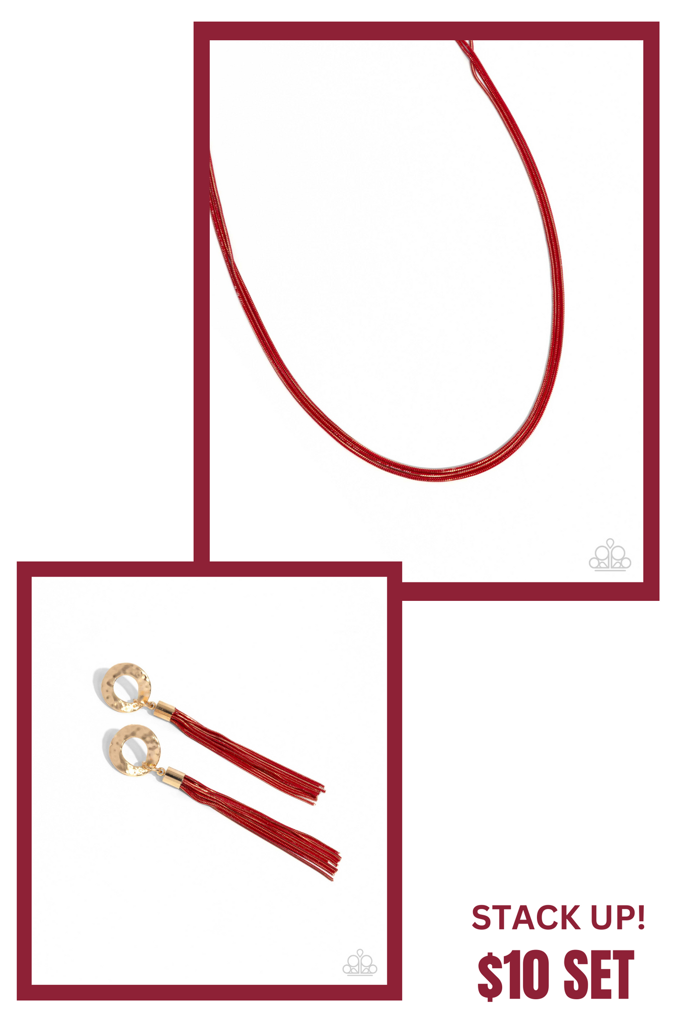 EARRING: Corded Character • Red P5PO-RDXX-080DF: Hammered in mesmerizing detail, a high-sheen gold disc glistens from the ear. Featuring shiny gold and red links, slim snake chains sway below the hammered disc from a gold cap fitting for an edgy mixed metallic lure. Earring attaches to a standard post fitting.