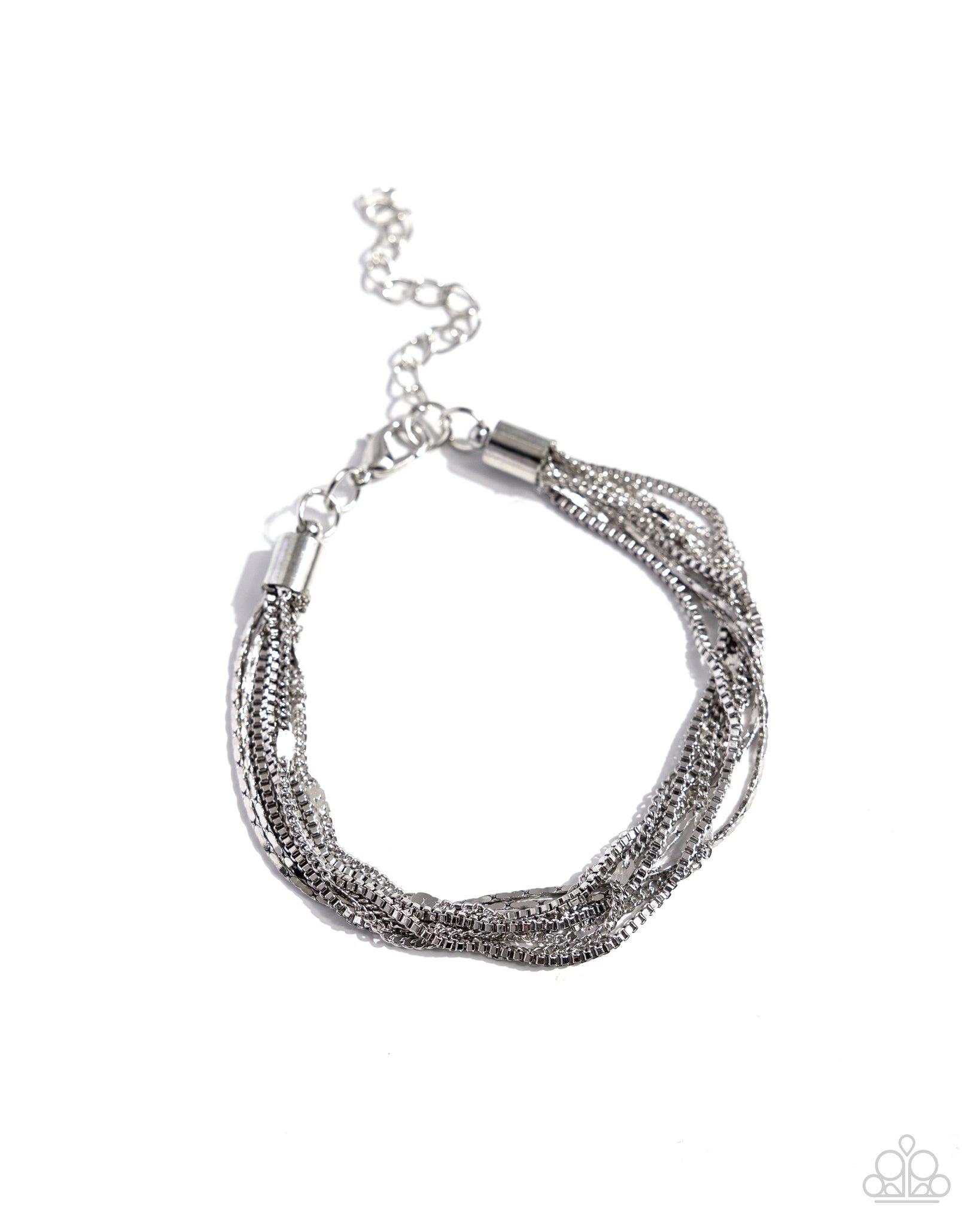 Featuring thick silver cap fittings, a collection of various delicate silver chains stream along the wrist in an industrial manner creating a show-stopping stack. Features an adjustable clasp closure.